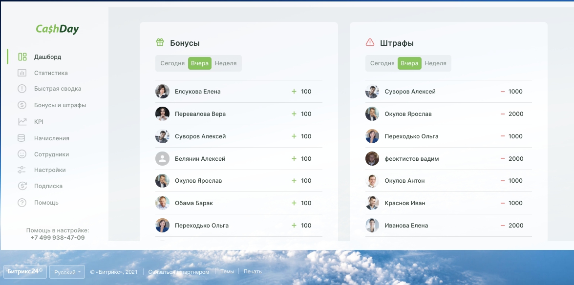CashDay позволяет назначить стоимость задачам, звонкам и любые действиям сотрудников в течение дня, сотрудники получают деньги на основе данных CRM, система сама считает KPI, проводит соревнования и контролирует сотрудников.