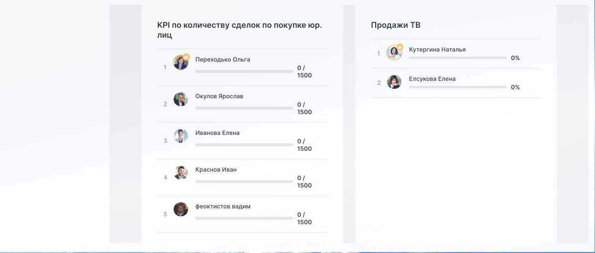 - Устраивает "соревнования" между сотрудниками и отделами продаж в режиме онлайн, в том числе возможен вывод данных на любое устройство