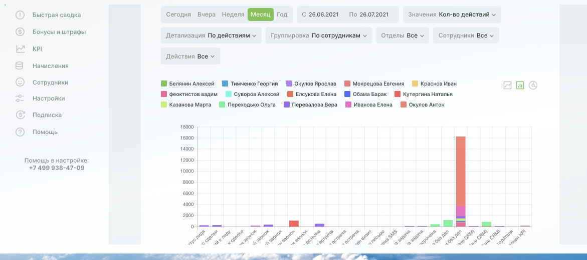 - Проводит глубокую аналитику действий пользователей в CRM,