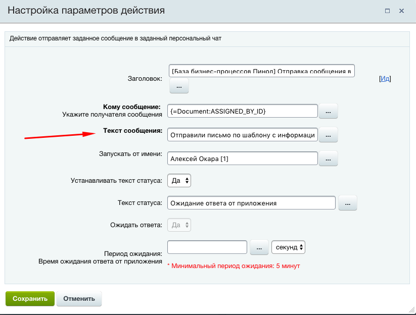 3. Активити: Отправка уведомлений в персональный чатЗадача данного активити — отправлять сообщения из бизнес-процесса в персональный чат портала Битрикс24 вашей компании. Таким образом, Вы не перегружаете уведомления в колокольчике и пишите требуемые уведомления в чат сотруднику, а он видит, как из браузера, так и с мобильного приложения, где требуется его подключение.