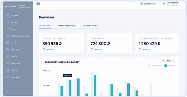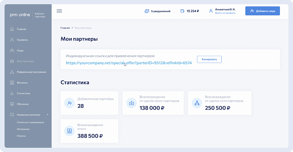 PRMOnline — облачная платформа для автоматизации партнёрских программ, которая помогает выстраивать прозрачные, масштабируемые и эффективные процессы взаимодействия с партнёрами: от их регистрации и обучения до получения лидов, расчёта вознаграждений и аналитики партнёрских продаж.