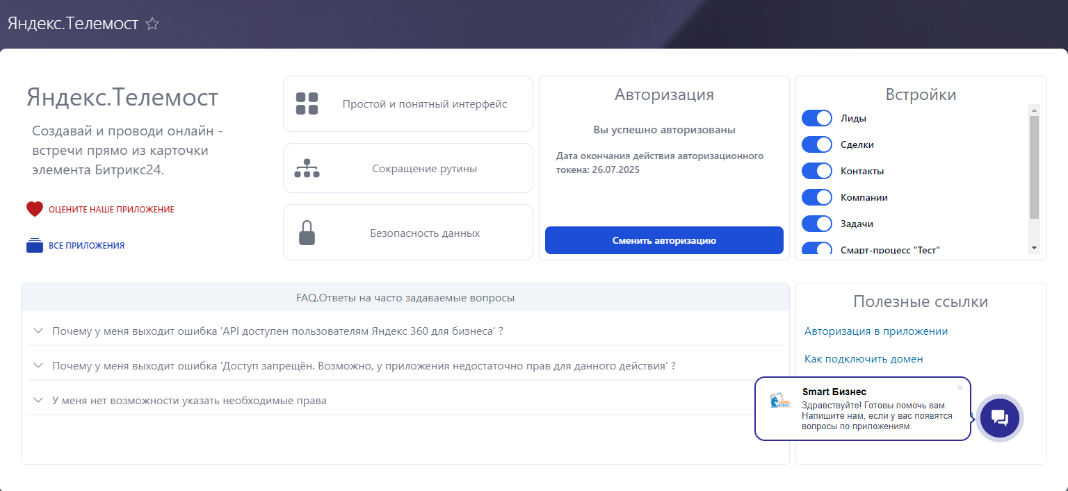 Приложение Telemost позволяет создавать и проводить онлайн - встречи и конференции прямо из карточки сделки Битрикс24.