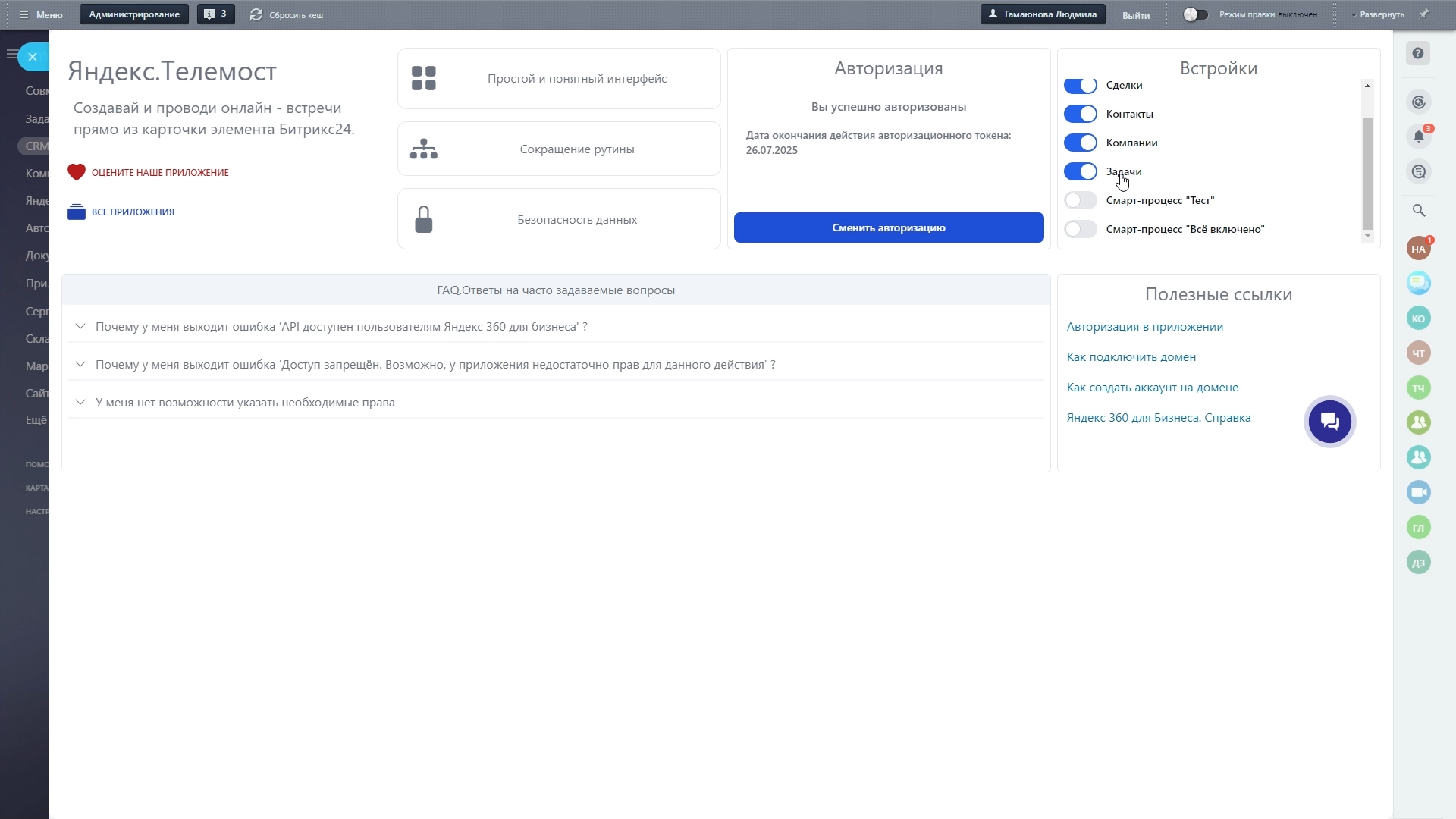 Еще мы добавили возможность формировать ссылку на встречу в Задачах Битрикс24, в отдельном разделе Яндекс.Телемост.