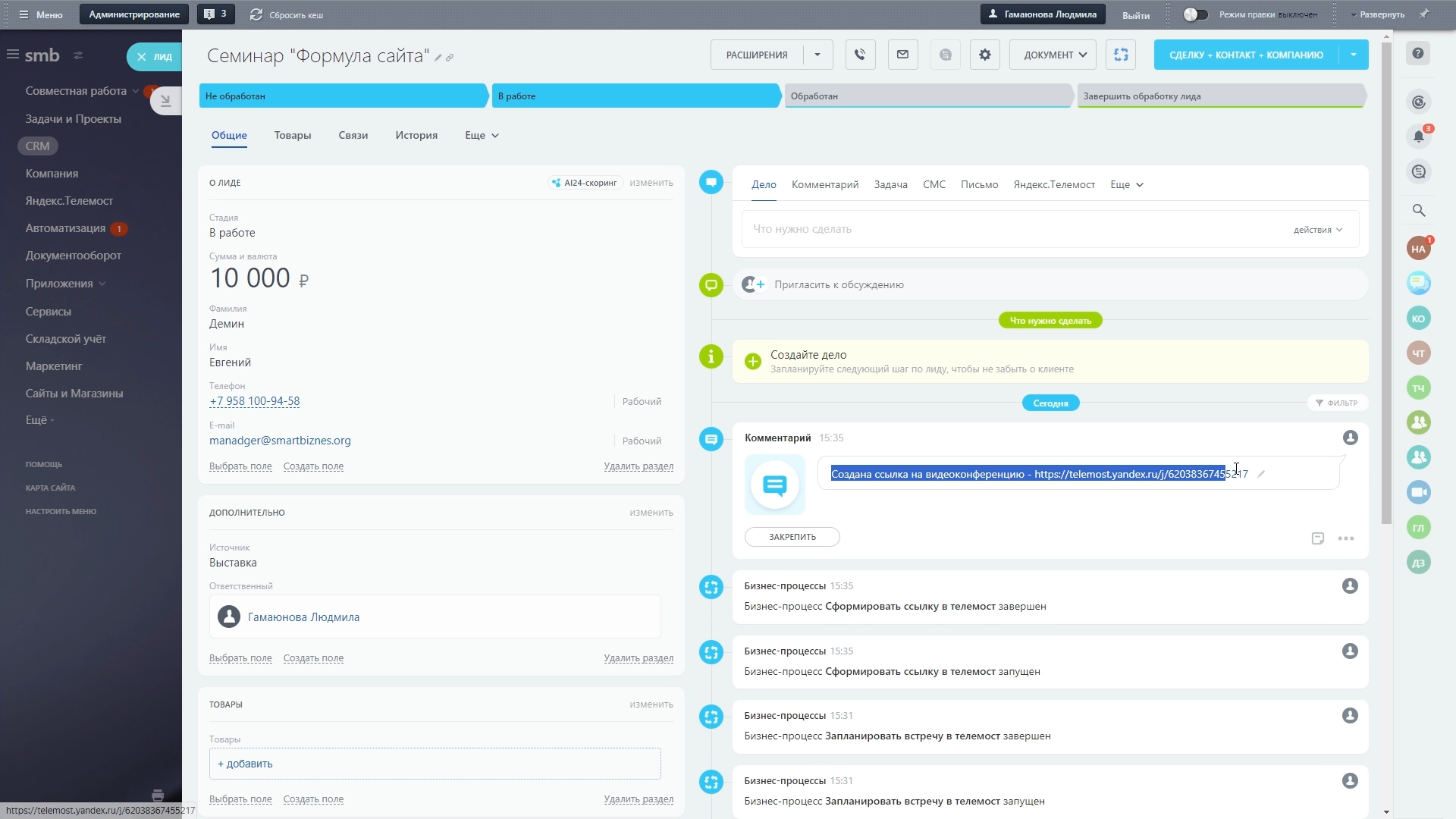 Приложение Telemost позволяет создавать и планировать онлайн-встречи и конференции прямо из карточки сделки CRM, в Задачах, в разделе Автоматизация Битрикс24. Назначать и планировать видеовстречи можно из кнопки Процессы, история отображаются на таймлайне в сделке.