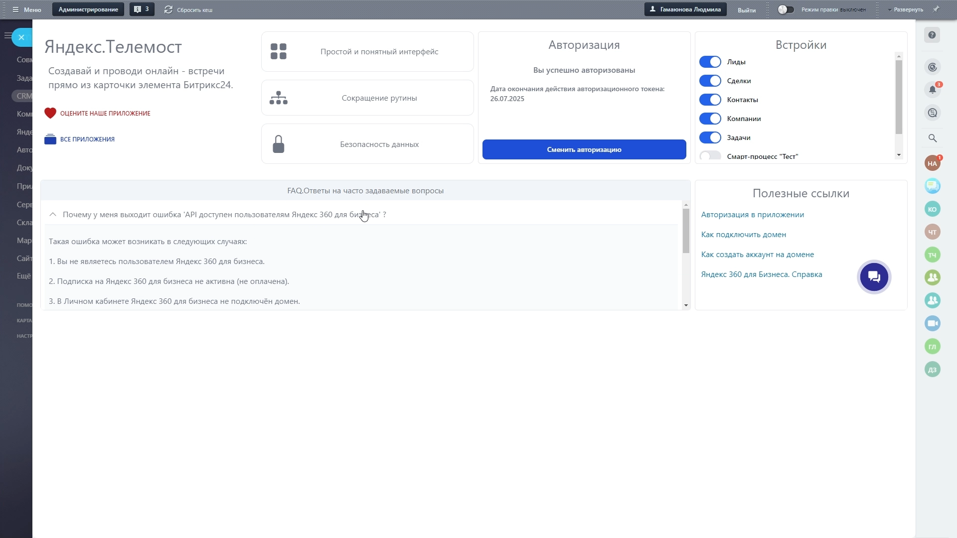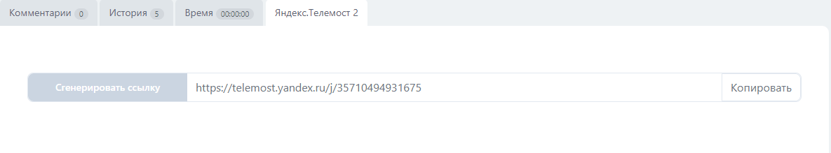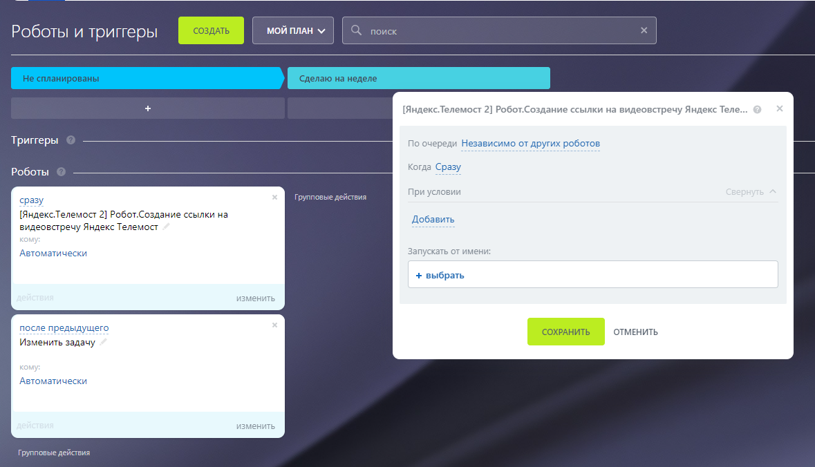Так же мы добавили создание ссылок на конференции Яндекс.Телемост через раздел Автоматизация. Это позволяет добавить ссылки в задачи, в описание карточек и дополнительные поля.