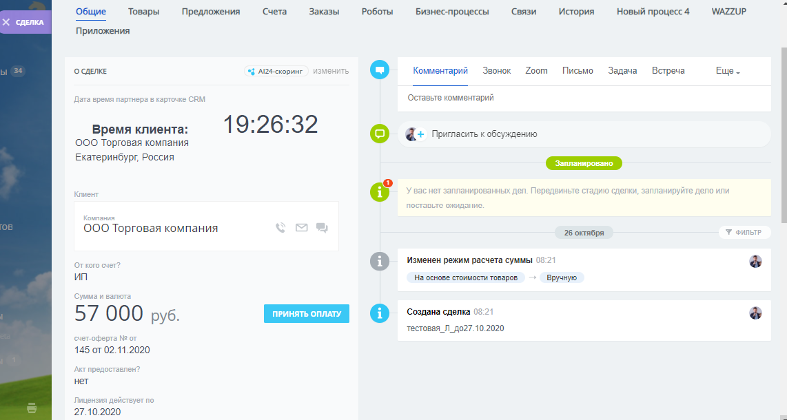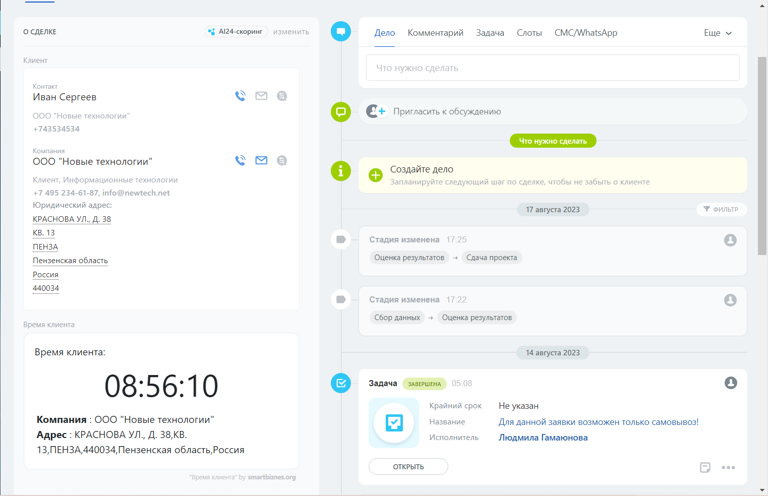 В обновлениях приложения часовой пояс подгружается из реквизитов компании, поля ИНН. Приложение показывает текущее время у клиента по его часовому поясу: в сделке, лиде, контакте, компании.