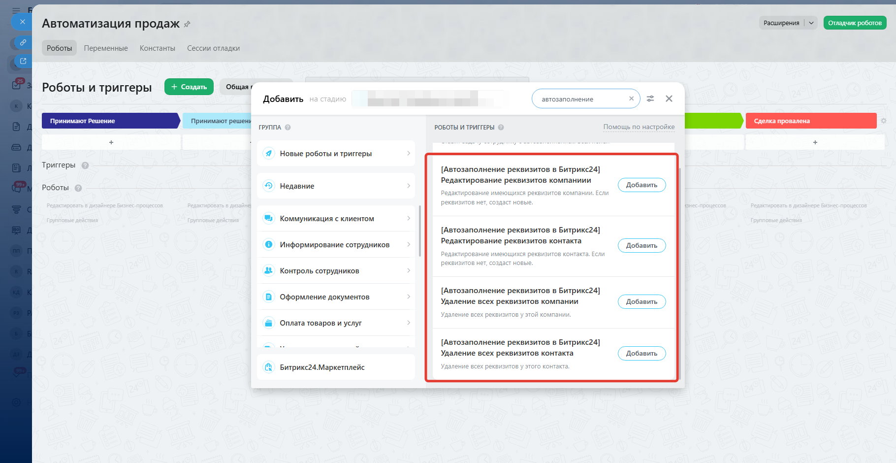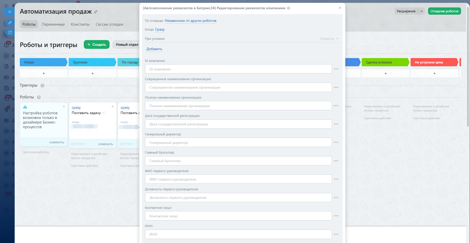 В стандартном функционале Битрикс24 роботы не умеют работать с реквизитами компаний и контактов. Из-за этого их приходится заполнять вручную или использовать сложные обходные решения.