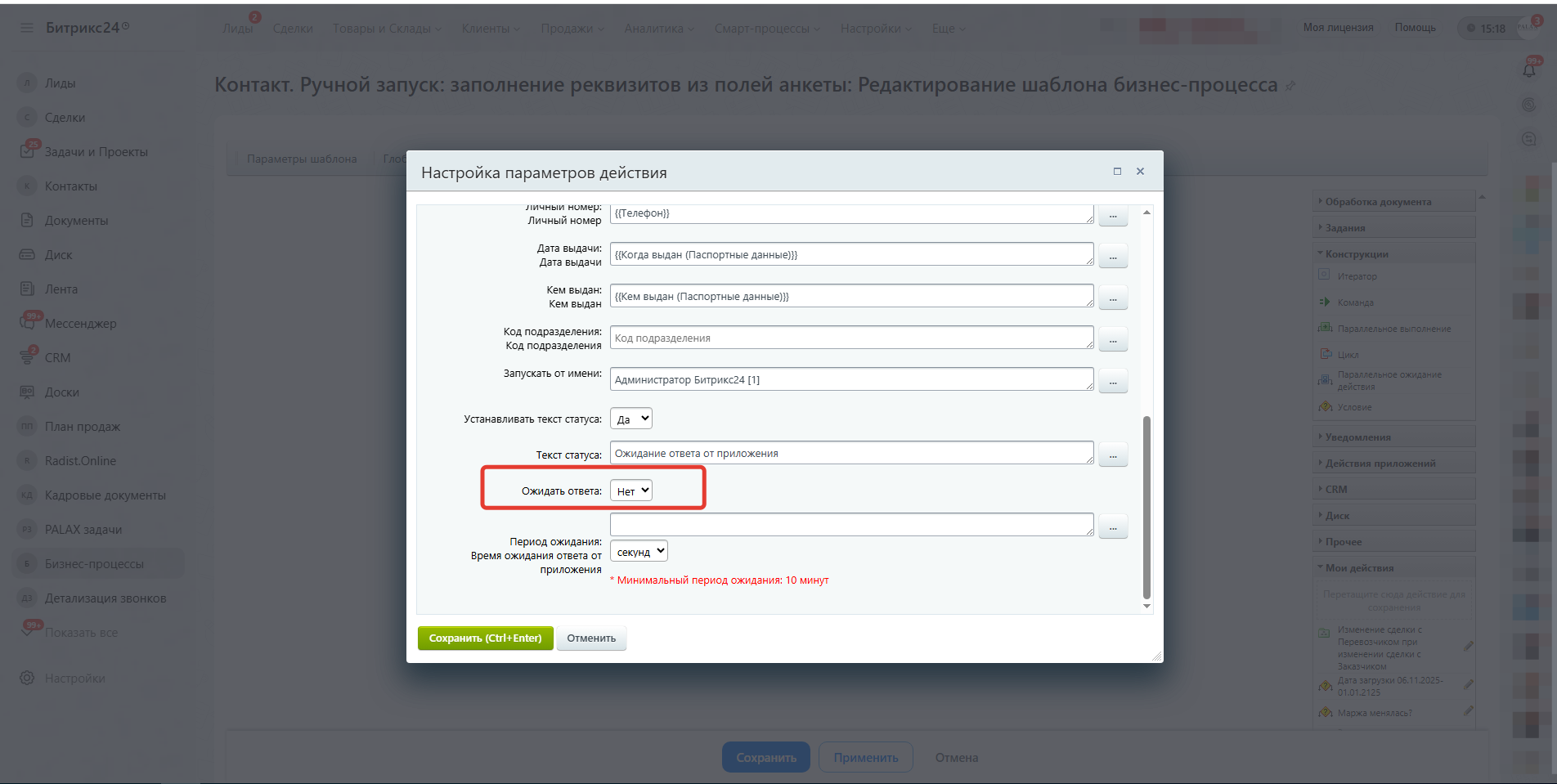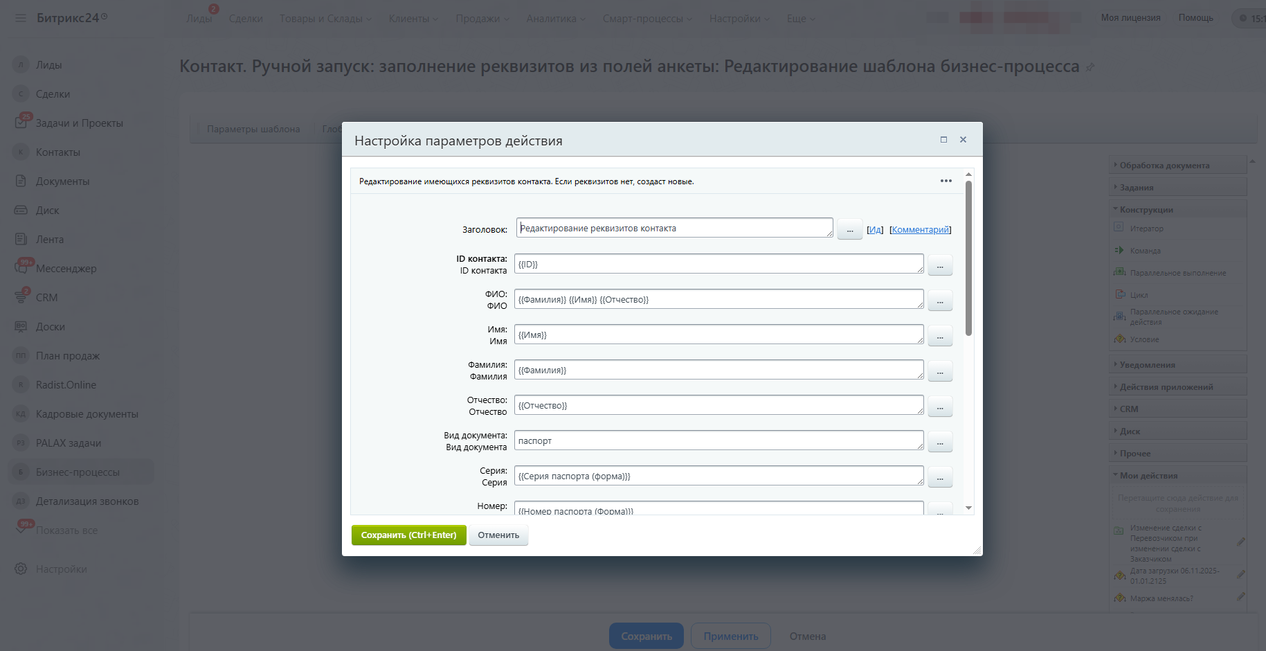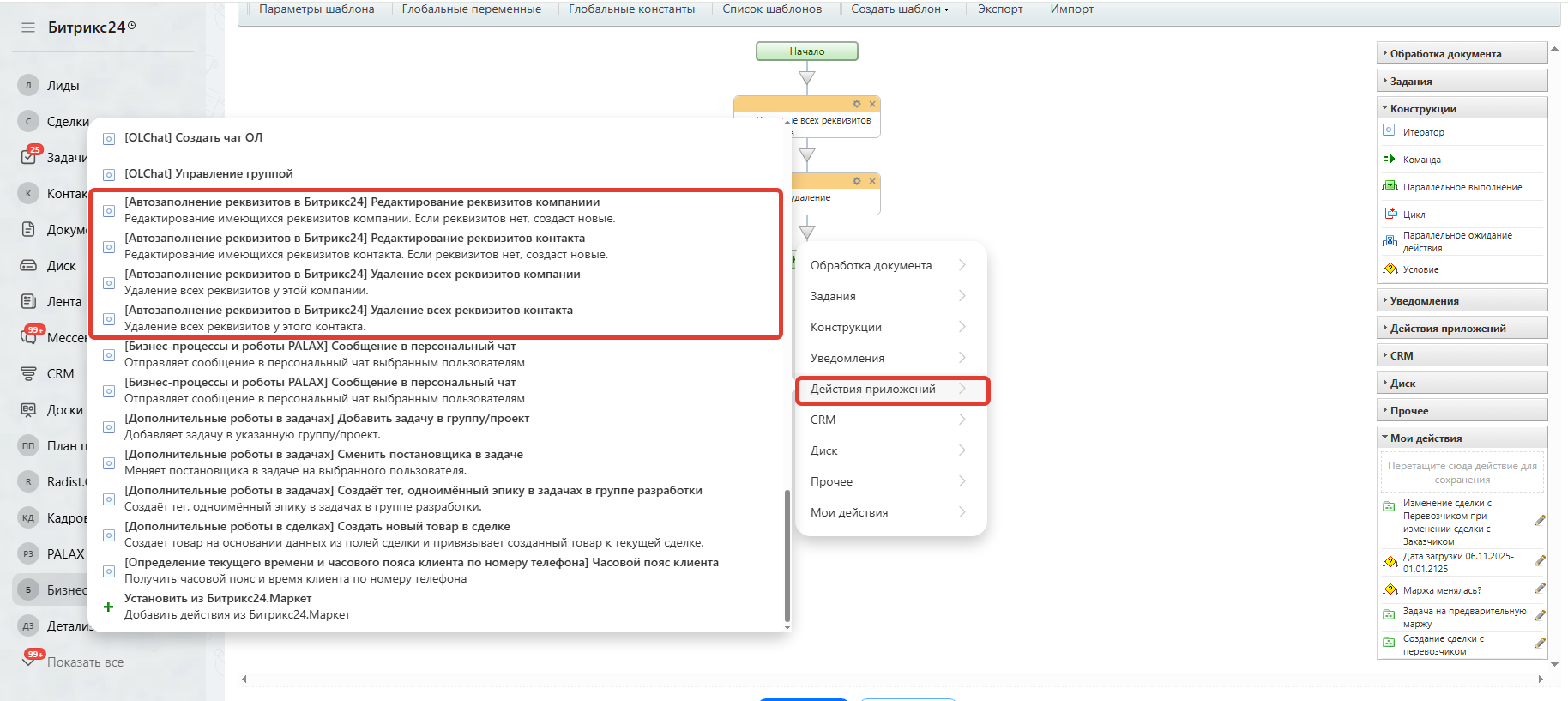Приложение «Автозаполнение реквизитов в Битрикс24», разработанное digital-агентством PALAX, добавляет возможность автоматически заполнять реквизиты через роботов и бизнес-процессы.