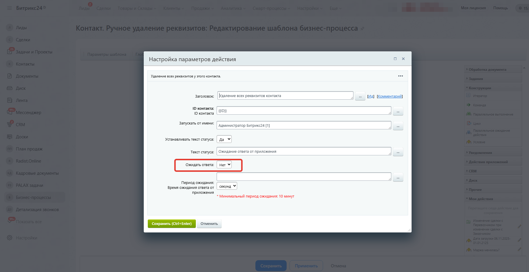 При одновременном использовании активити с удалением реквизитов и активити с заполнением реквизитов используйте минимальную паузу 10 минут между ними. Иначе второе активити может не сработать. Так же в активити указывайте в параметрах "Ожидать ответа" - "нет" см. скриншот выделено красным.