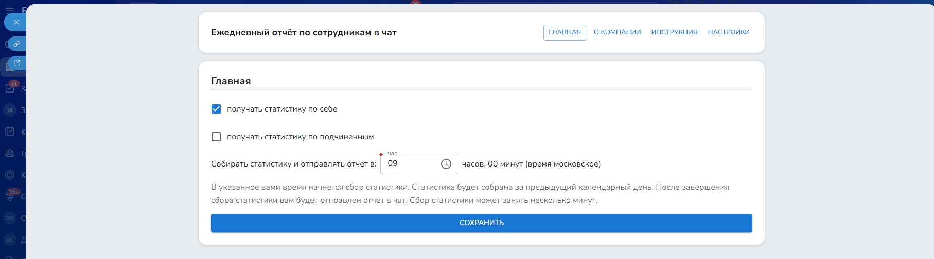 4. Удобное планирование времени формирования отчета. Приложение позволяет настроить время начала сбора статистики для формирования отчета (например, в 9:00 утра). Запуск начала сбора статистики настраивается по московскому времени. После завершения сбора статистики в чат будет отправлен отчет. Сбор статистики может занять несколько минут.