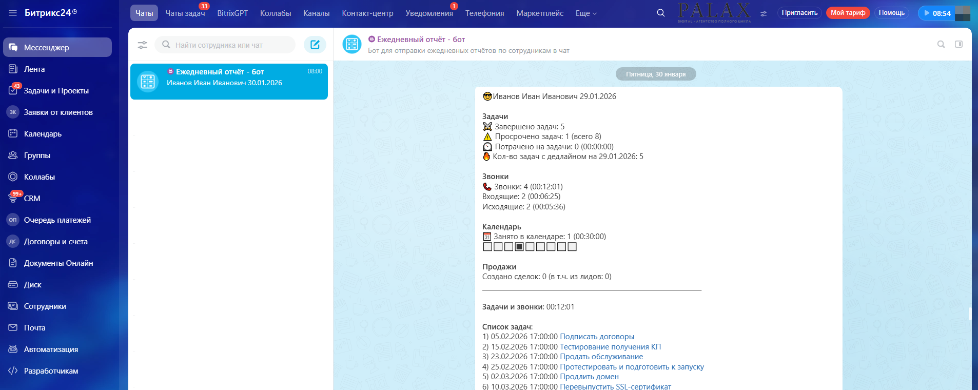 Приложение «Ежедневный отчёт по сотрудникам в чат» разработано digital-агентством PALAX. Вы сможете быстро проанализировать статистику по выполнению задач и продажам у себя и своих подчиненных.