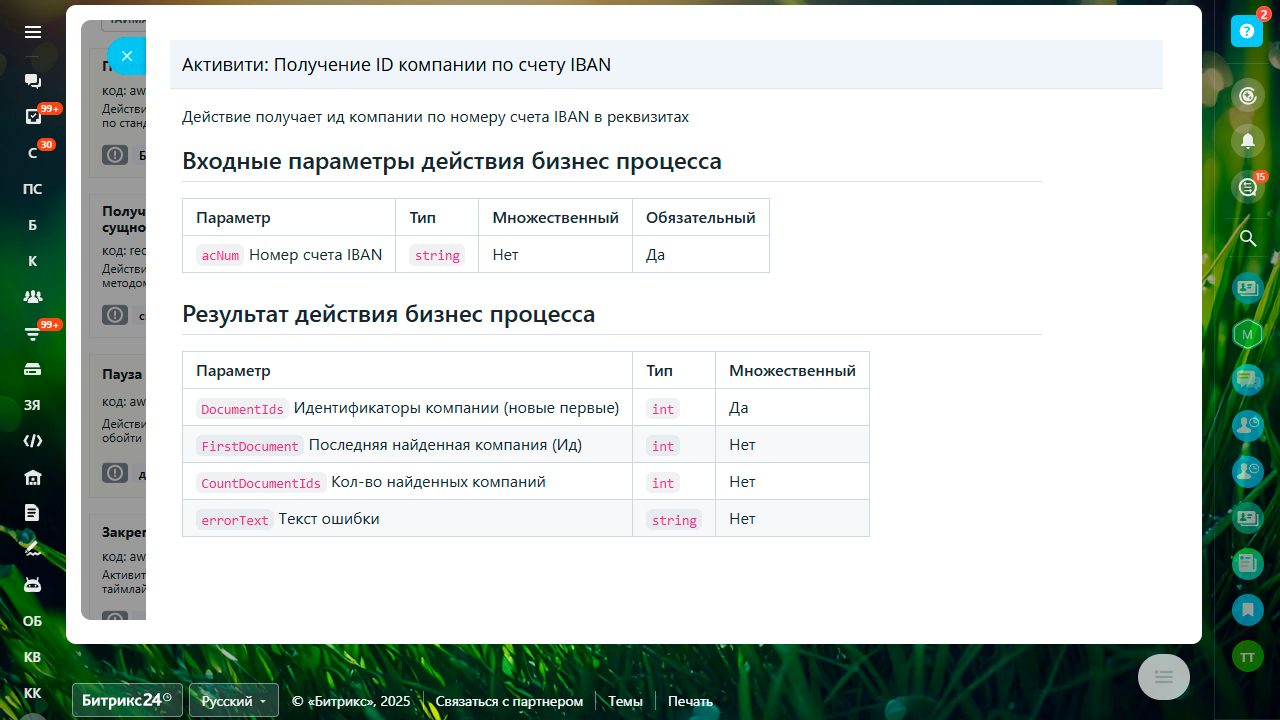 Действие (робот) найдет компанию по IBAN счета в реквизитах. Будет полезно при организации логики загрузки банковских выписок. - Склонение даты по падежам.