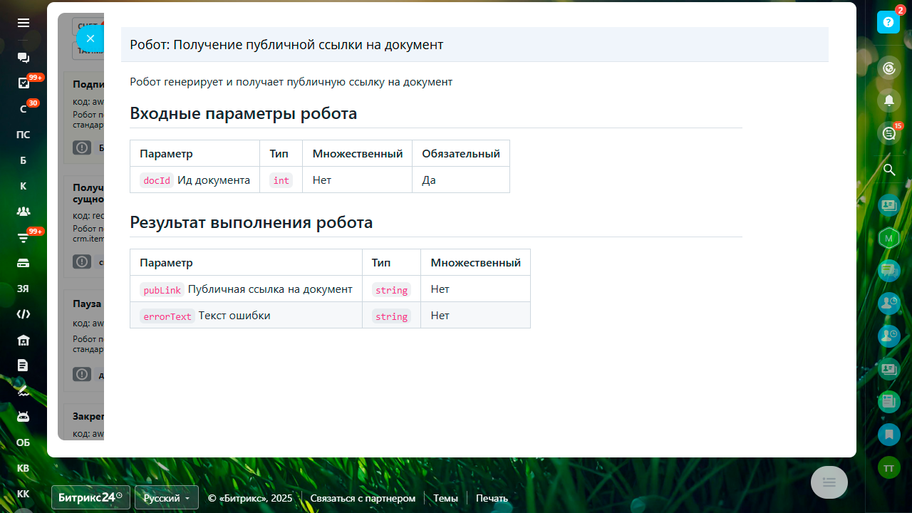 Действие позволяет сгенерировать и получить публичную ссылку на документ (по умолчанию ссылка не создается). - Получить информацию о реквизите по ид.