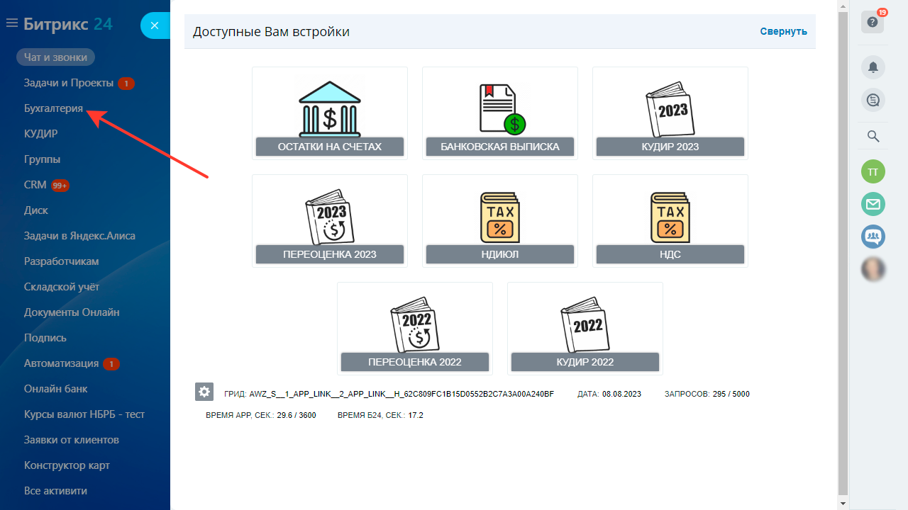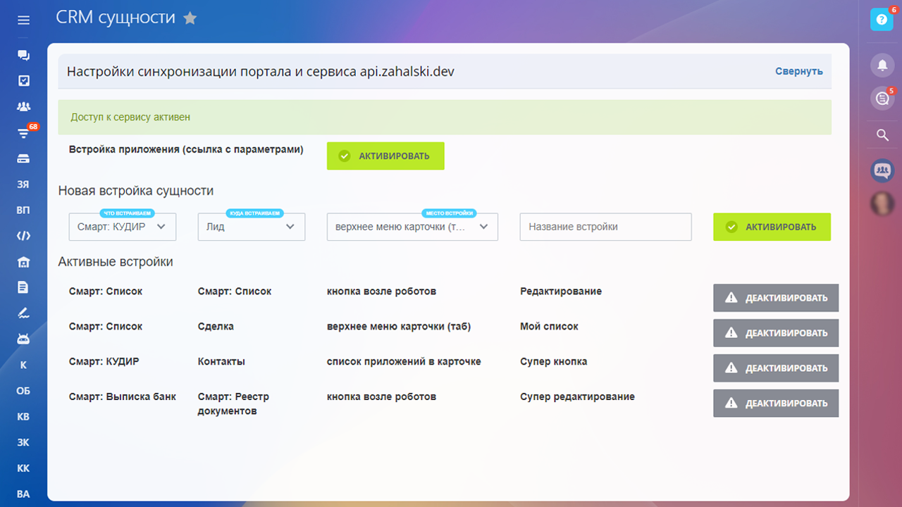 Приложение позволяет встраивать Смарт процессы, задачи, дела, документы, контакты, компании, сделки, лиды, универсальные списки, RPA.