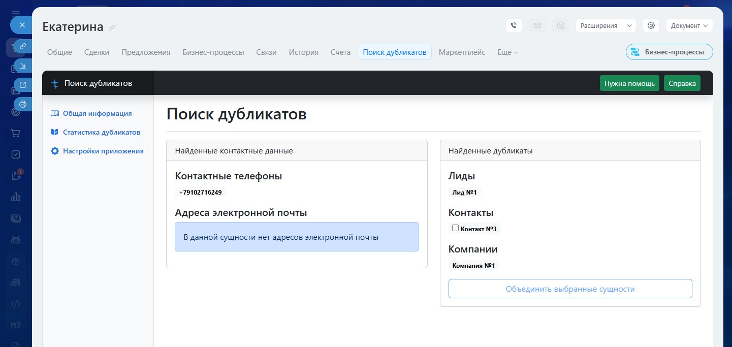 При открытии лида, контакта, сделки или компании приложение выполняет поиск возможных совпадений и отображает найденные дубликаты. Менеджер может сразу увидеть, существуют ли в системе другие записи с совпадающими данными.