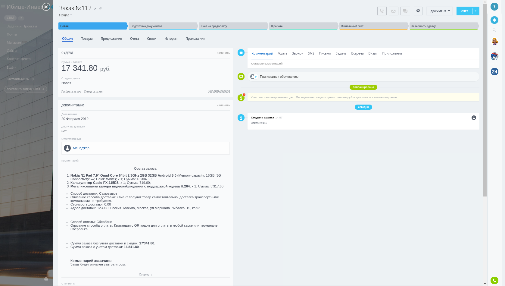 - Передача списка товаров из заказа в CS-Cart в специальный раздел сделки либо в виде текстового комментария.