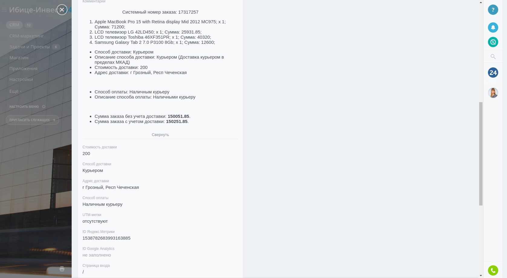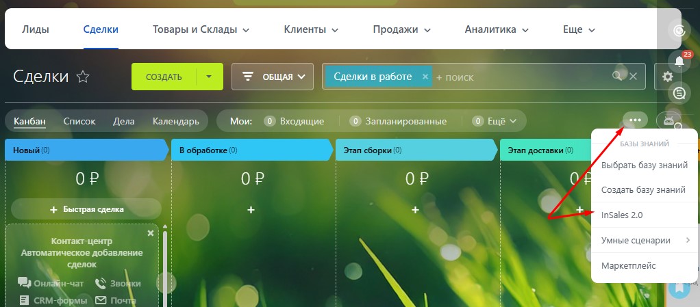- Передача списка товаров из заказа в InSales в специальный раздел сделки в формате карточек товаров либо в виде текстового комментария;