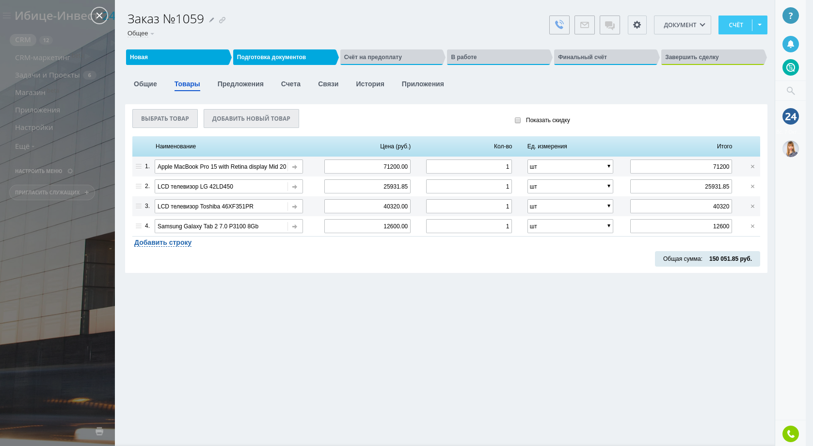 - Синхронизация списка товаров после создания сделки. Как только вы добавите к сделке в Битрикс24 новый товар или удалите существующий, то же самое произойдет и в соответствующем заказе в InSales. Точно так же и наоборот;