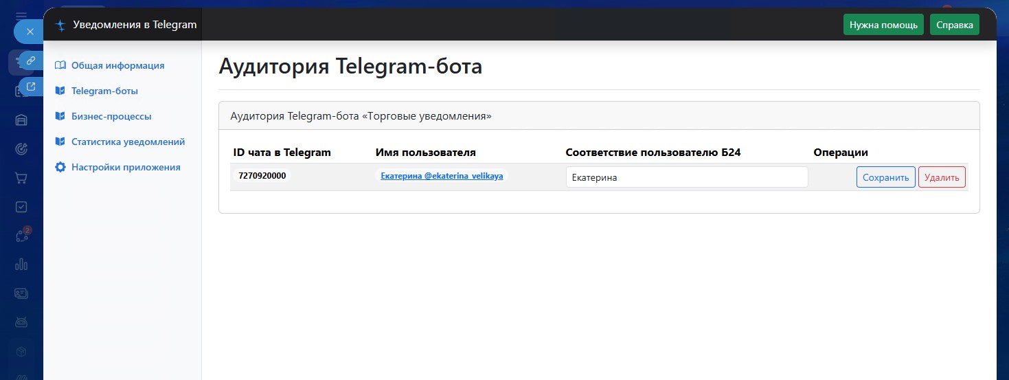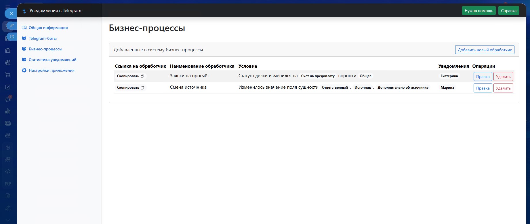 Приложение обеспечивает автоматическое оповещение в Telegram об изменениях в лидах и сделках в CRM «Битрикс24».
