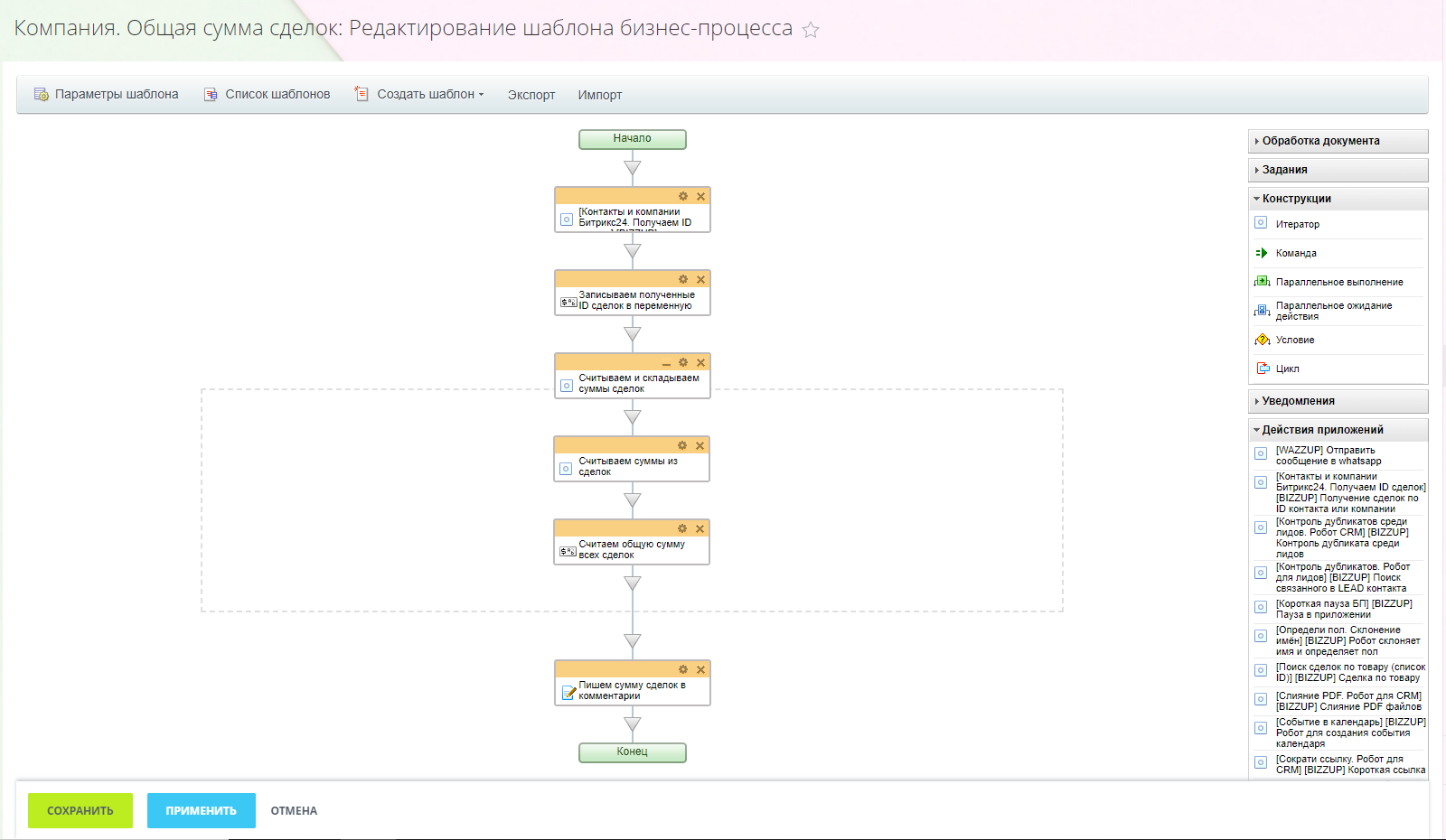 Скачать пример бизнес-процесса для расчета общей суммы сделок компании по ссылке.