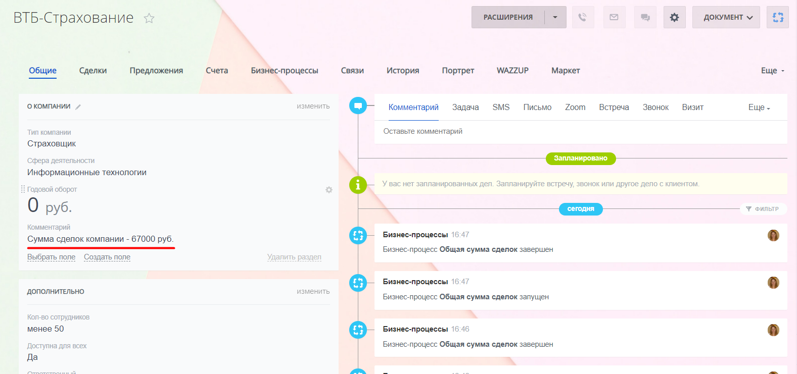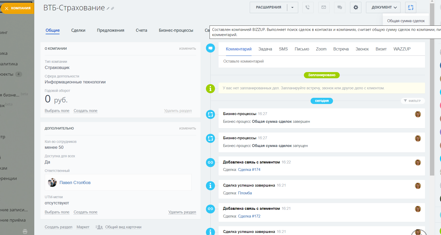 3. Для подсчета общей суммы сделок контакта или компании через бизнес-процесс.