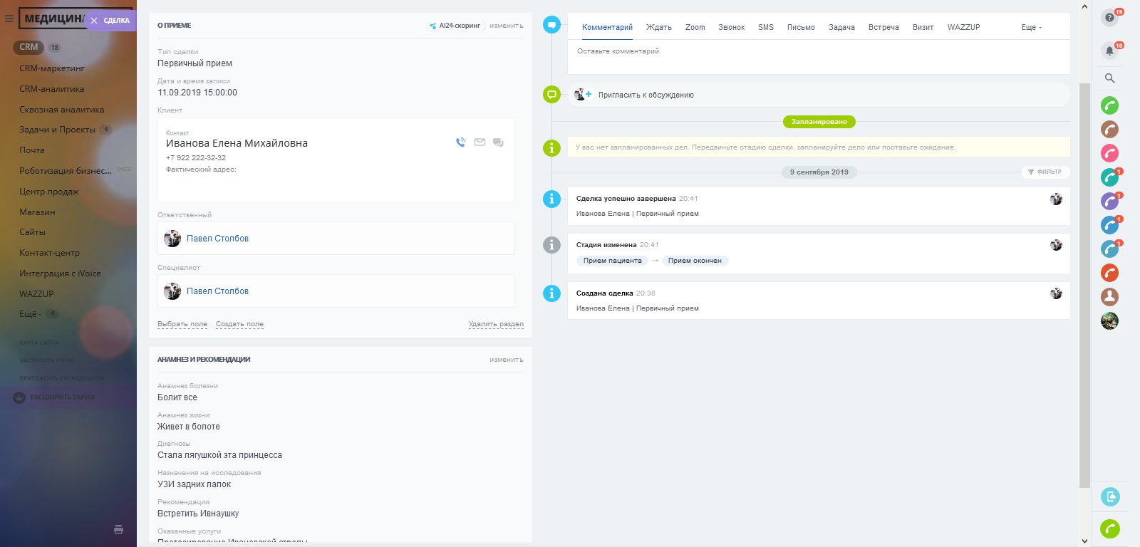 К созданному или существующему контакту создается сделка (запись на прием) с указанием пациента, специалиста, даты, времени записи, а также администратора, выполнившего запись. В случае изменения даты/времени приема в МИС, также меняем его в Б24. В случае отмены записи, бракуем сделку в Б24