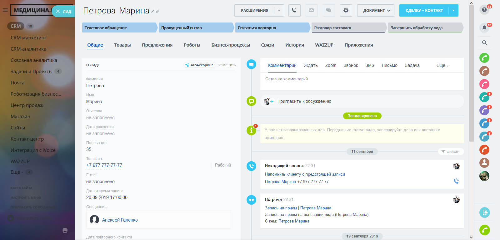 Если звонок не качественный, то администратор бракует лид руками, если же звонок от пациента, который хочет записаться на прием, двигаемся дальше