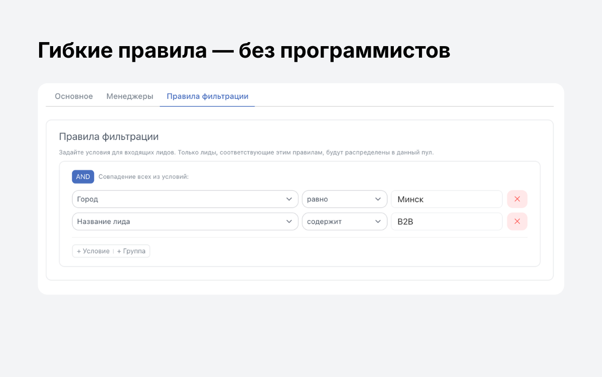 - Гибкие правила фильтрации — направляйте лиды по значению любого поля CRM: источник, сумма, город, UTM-метки и пользовательские поля