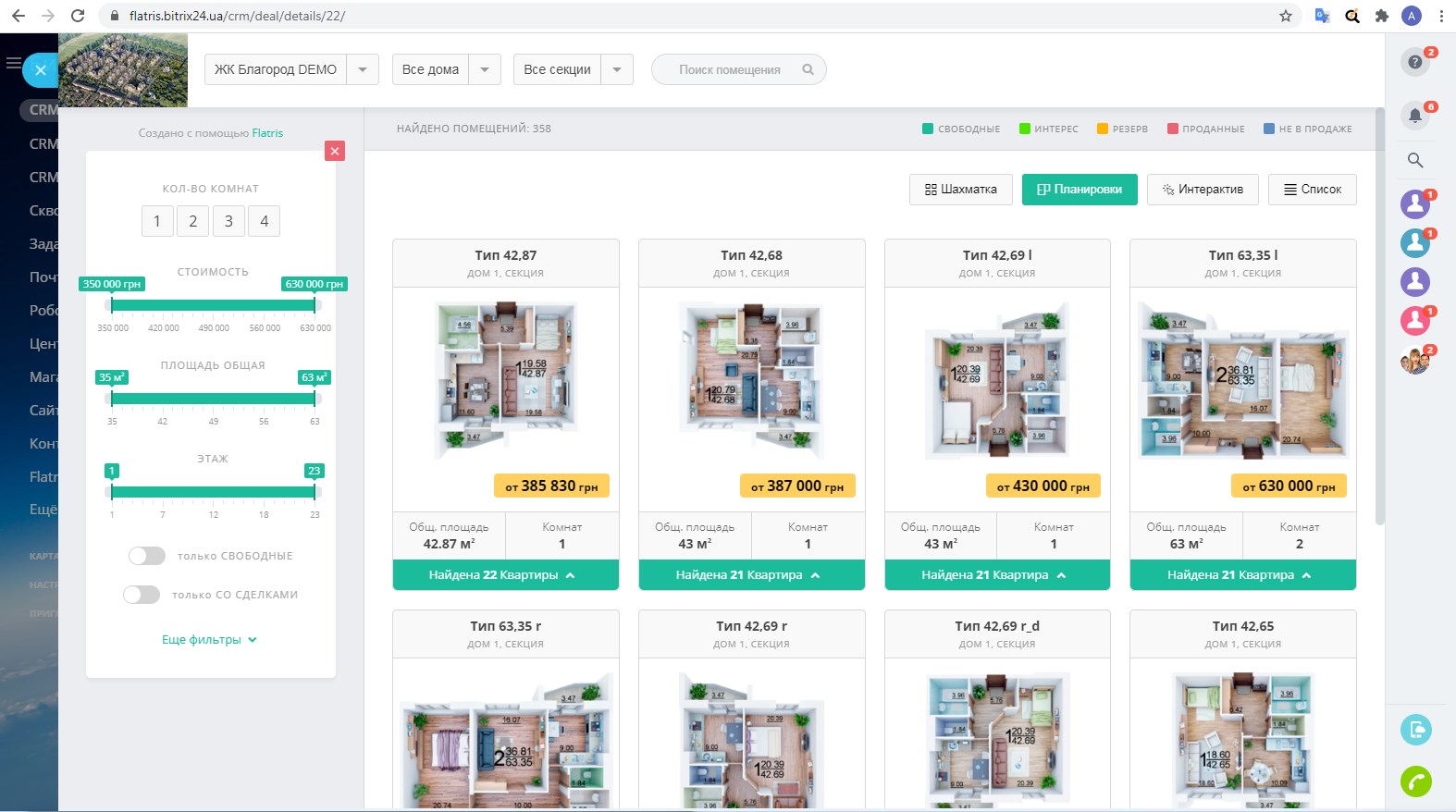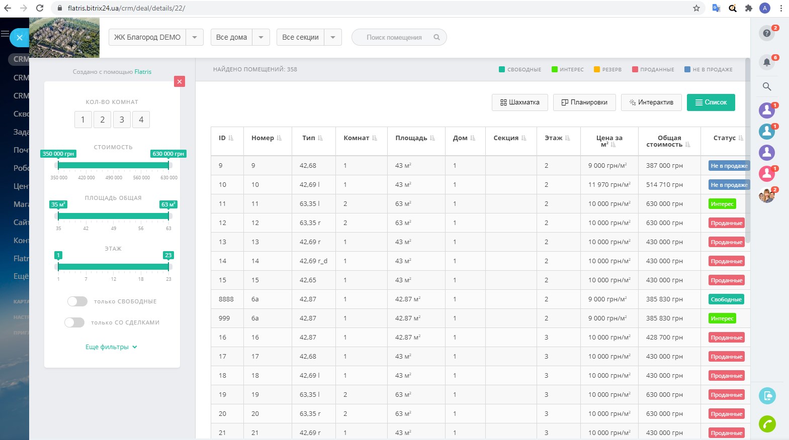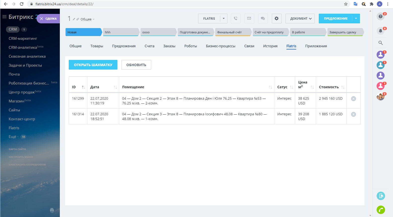 После установки и настройки приложения Flatris, в Битрикс 24 в карточке каждой сделки появится вкладка "Flatris":