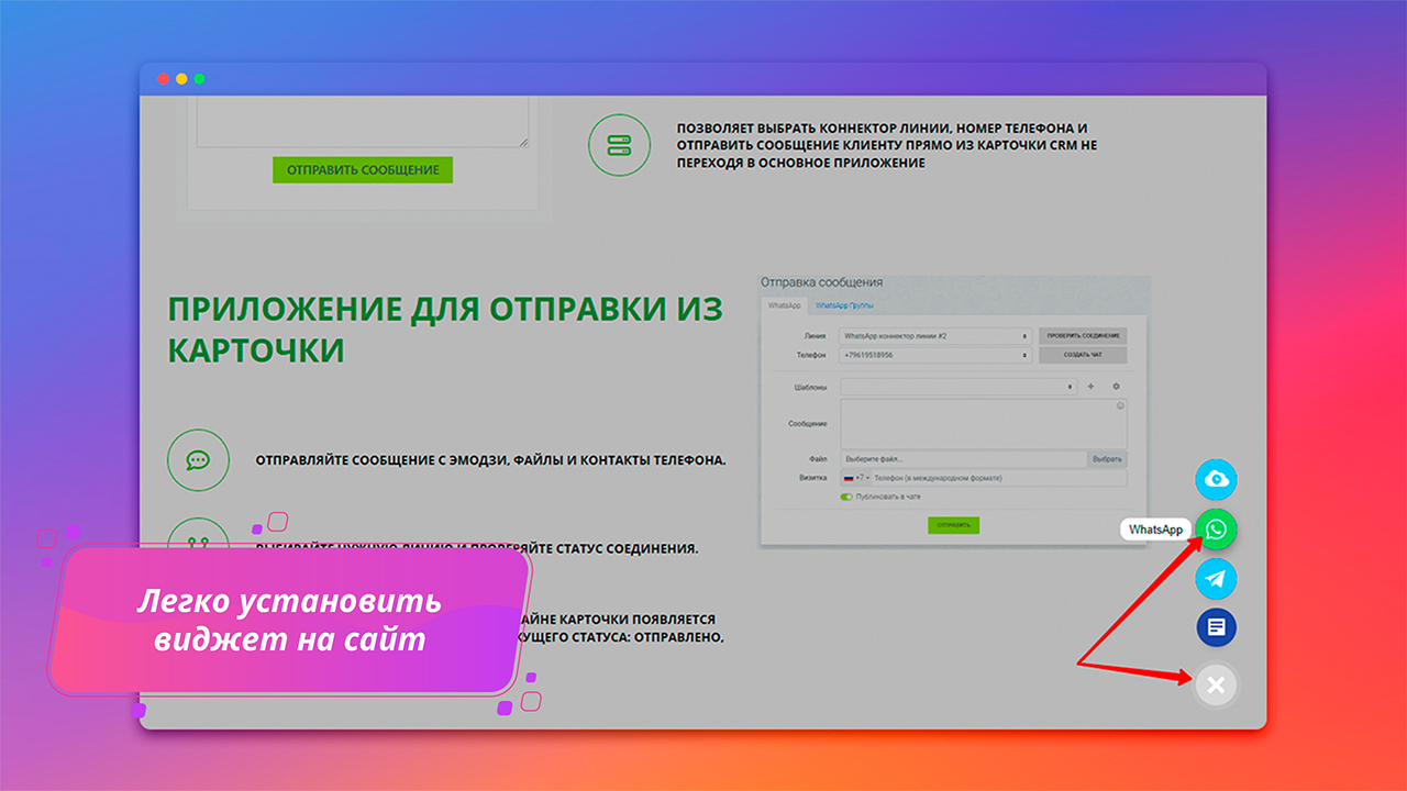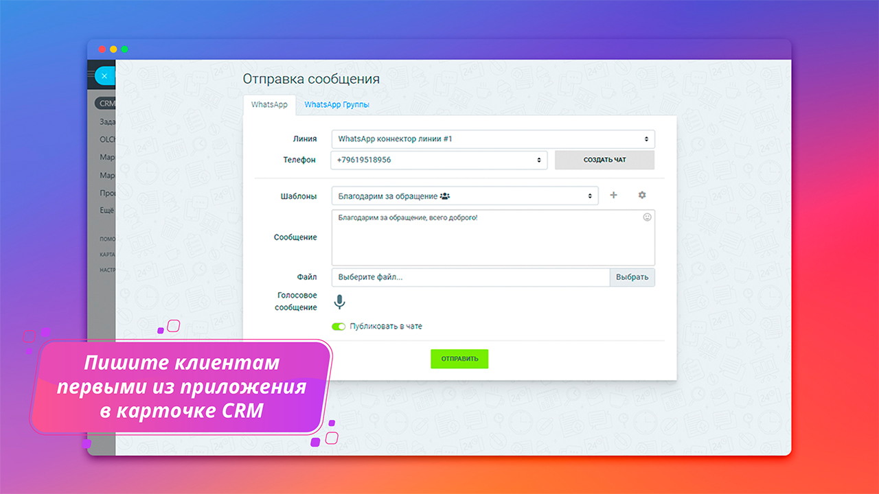 - Виджет позволяет выбрать коннектор линии, номер телефона и отправить сообщение клиенту прямо из карточки CRM не переходя в основное приложение