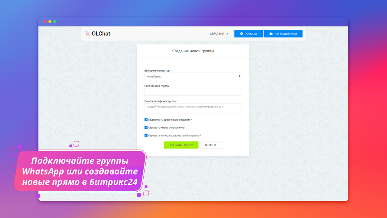 Подключите Чаты и Группы WhatsApp к открытым линиям! Приложение специально разработано для работы с открытыми линиями.