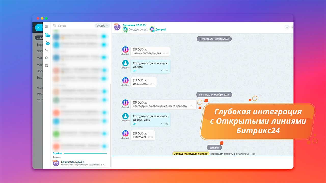 ✔ Мы глубоко интегрируемся с Открытыми линиями Битрикс24 и учитываем их особенности. Теперь при создании чата из нашего приложения в карточке CRM, чат сразу распределяется на его создателя, а не в общую очередь Открытой линии или на ответственного сотрудника.