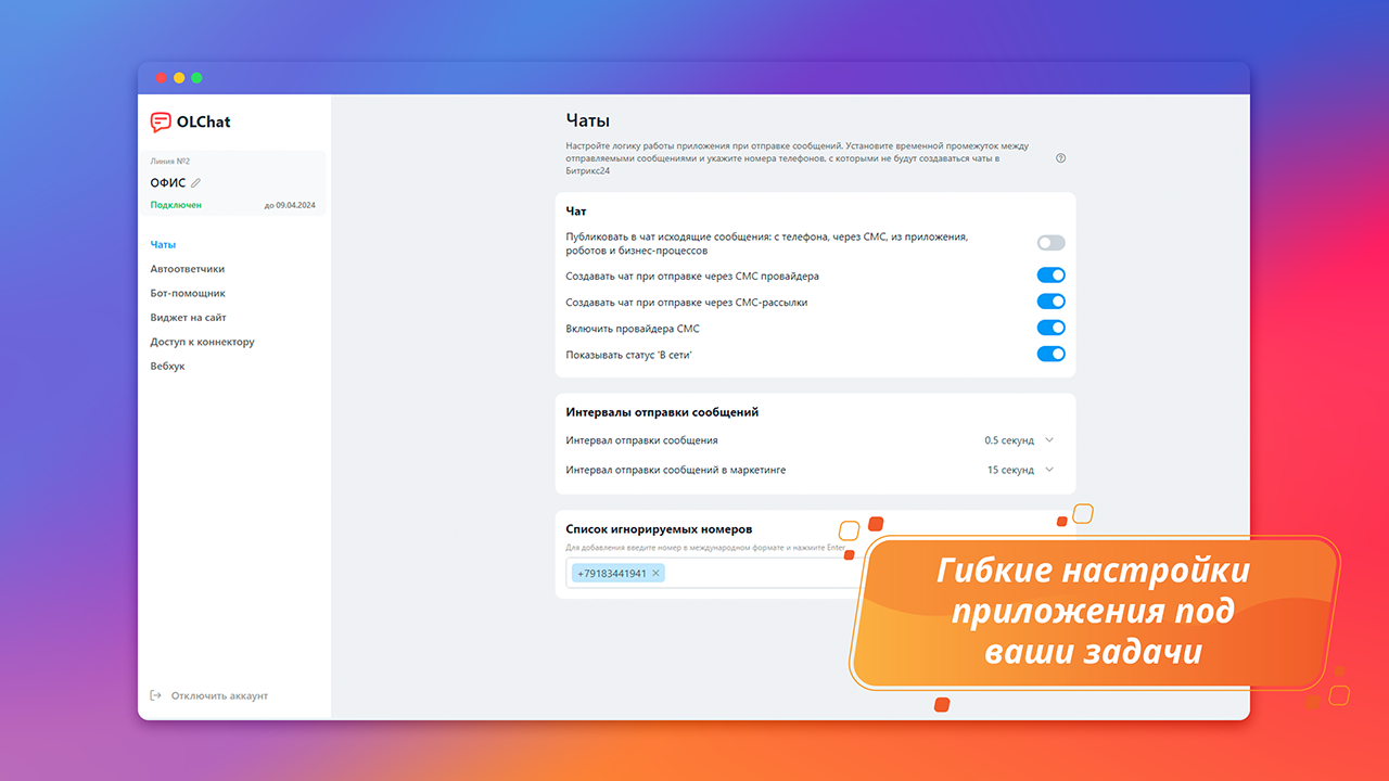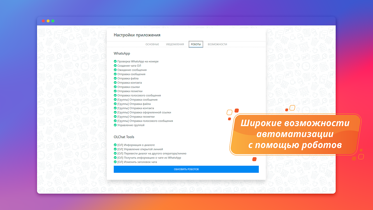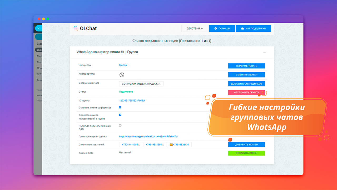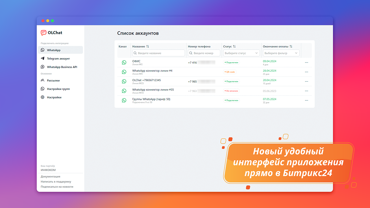 - Виджет «OLChat — статусы и чаты» информирует о том, на каких номерах клиента установлен WhatsApp