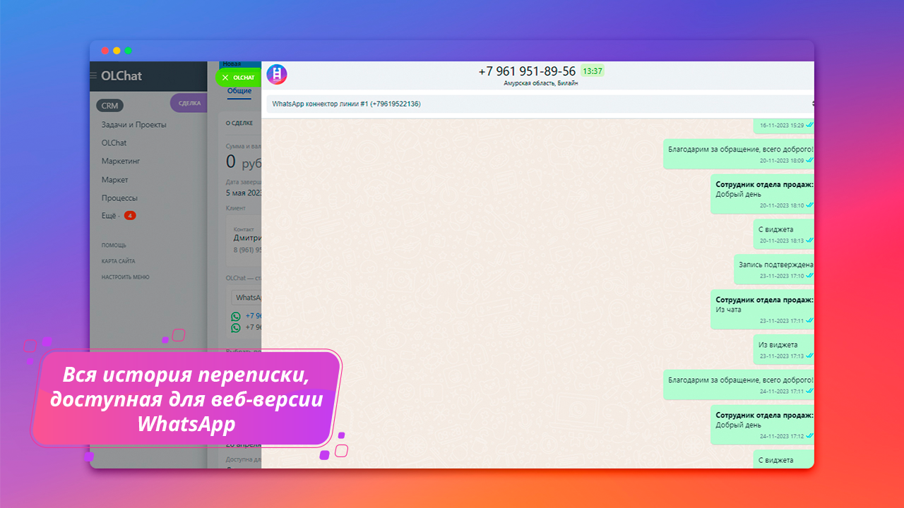 - Из виджета OLChat вы можете открыть всю историю переписки, доступную для веб-версии WhatsApp