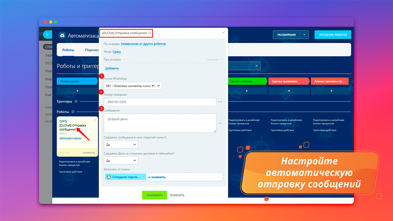 - Настройте робота «Управление открытой линией», чтобы автоматически совершать действия для текущего оператора диалога, например принять диалог