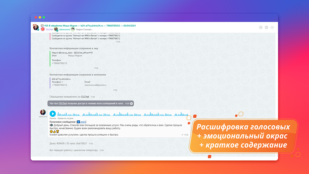 ✔ Автоматическое преобразование голосовых сообщений в текст теперь длительностью до 5 минут. Кроме того, мы добавили отображение эмоциональной окраски и краткое содержание голосового сообщения, чтобы ваши менеджеры экономили время и лучше понимали клиента.