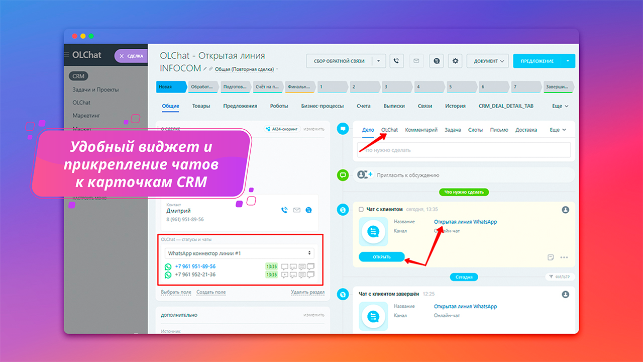 - Обеспечивает быстрый доступ из карточки любой сущности CRM к созданию нового чата или переходу в имеющийся, а также к самому приложению