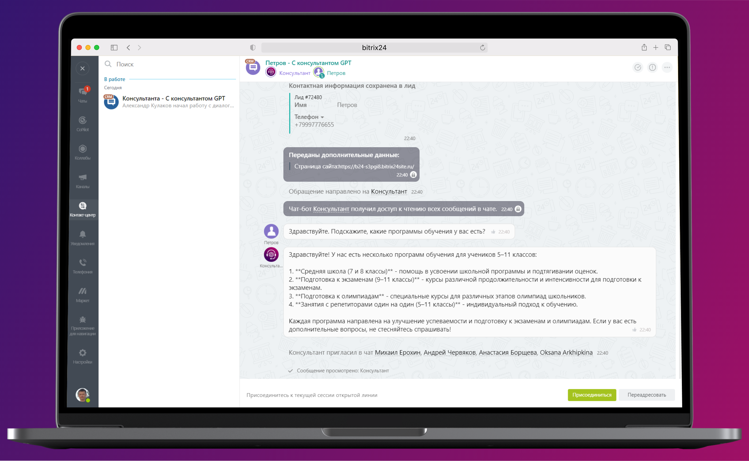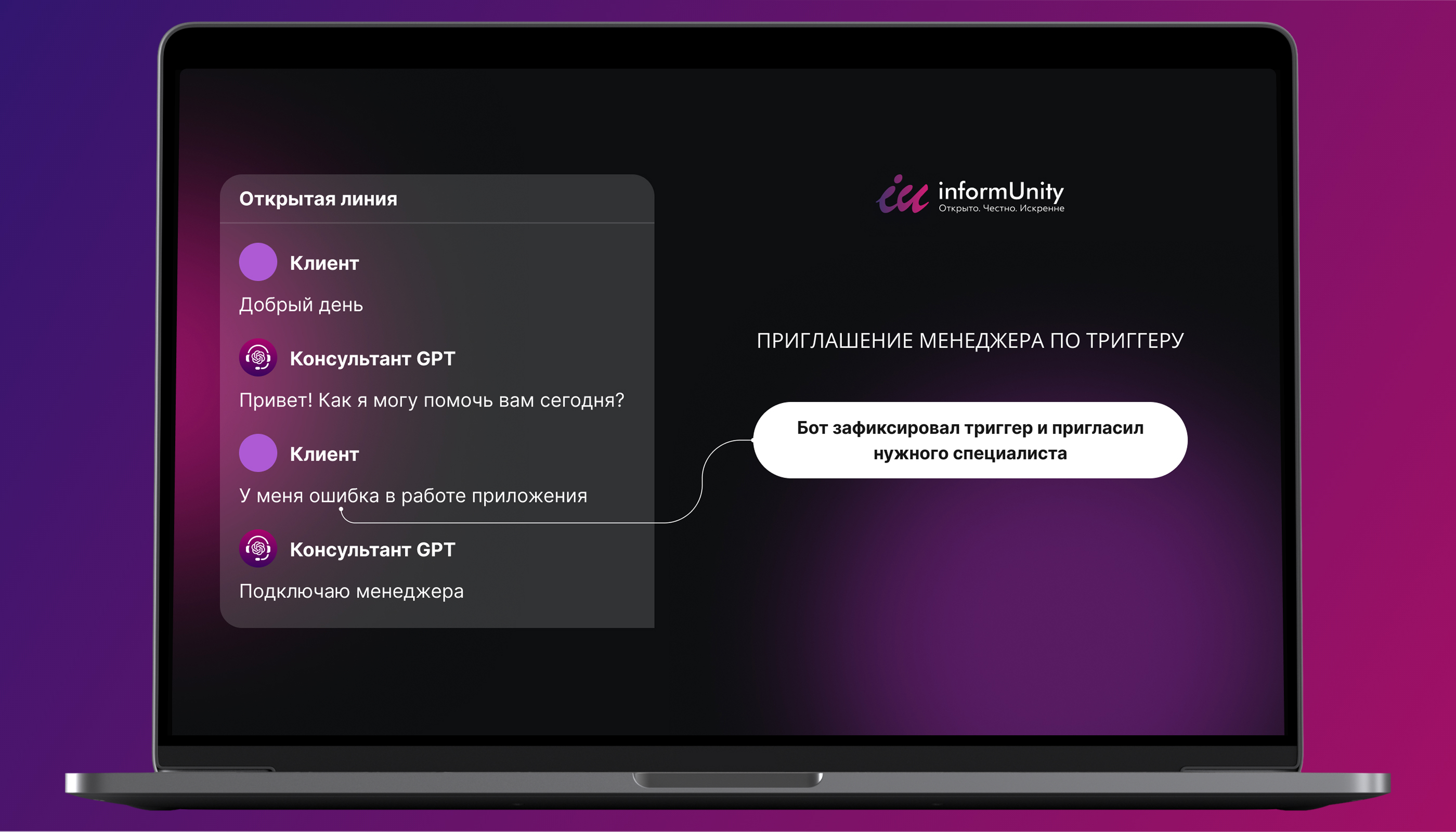 Приглашает в чат специалистов: по ключевым словам переадресует диалог на определенного сотрудника или отдел.