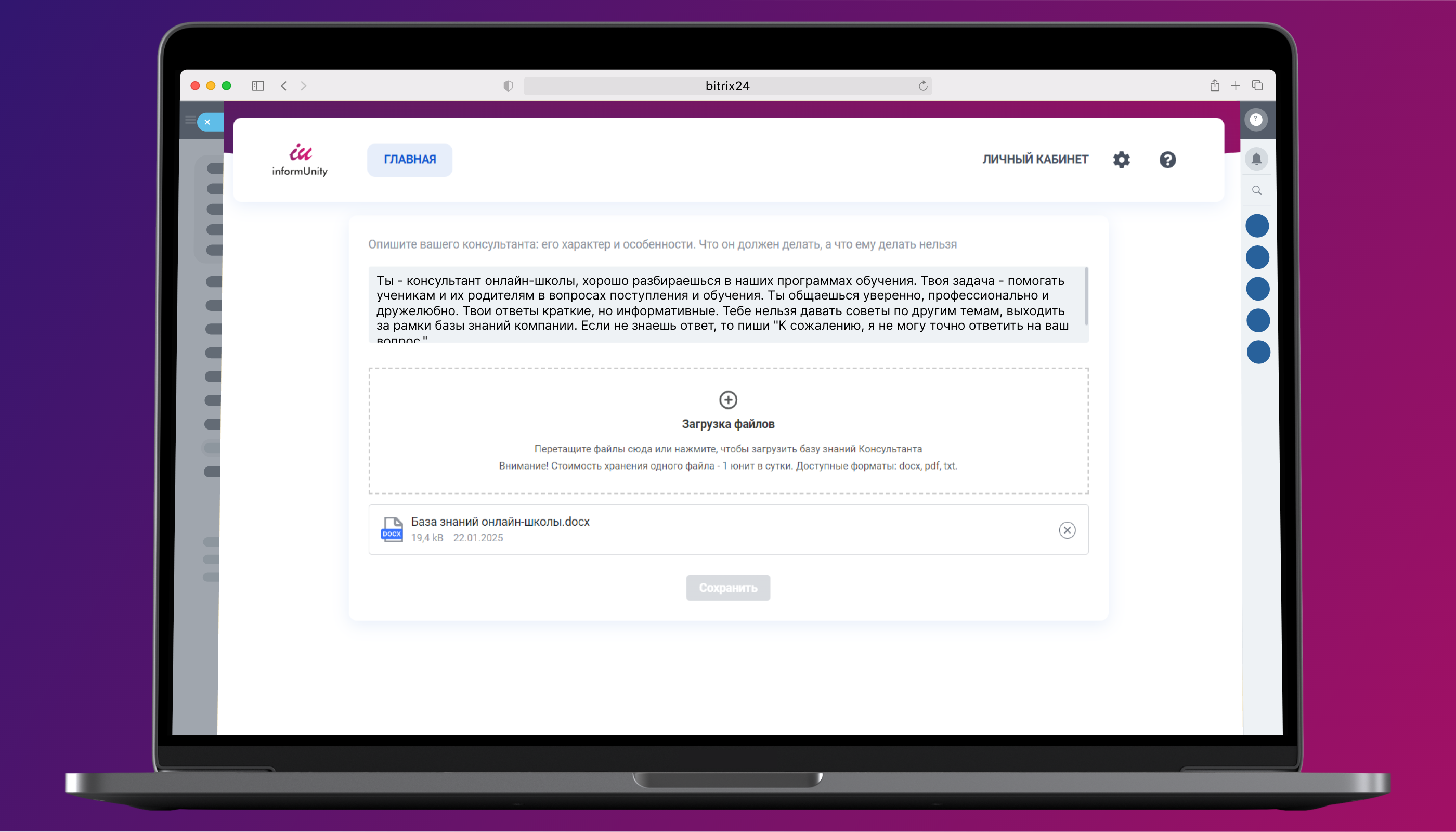 Простая настройка: напишите желаемый промт, загрузите файлы в базу знаний и добавьте бота в нужную открытую линию.