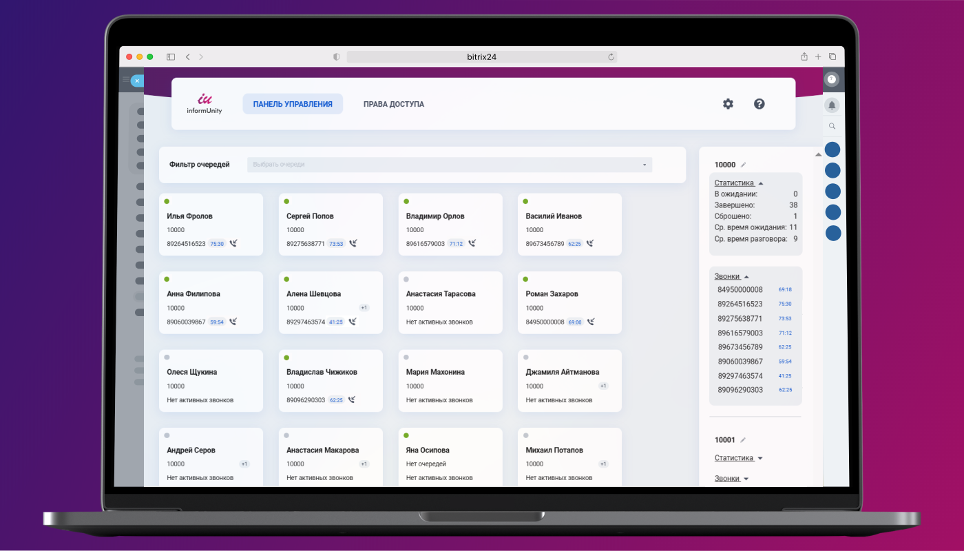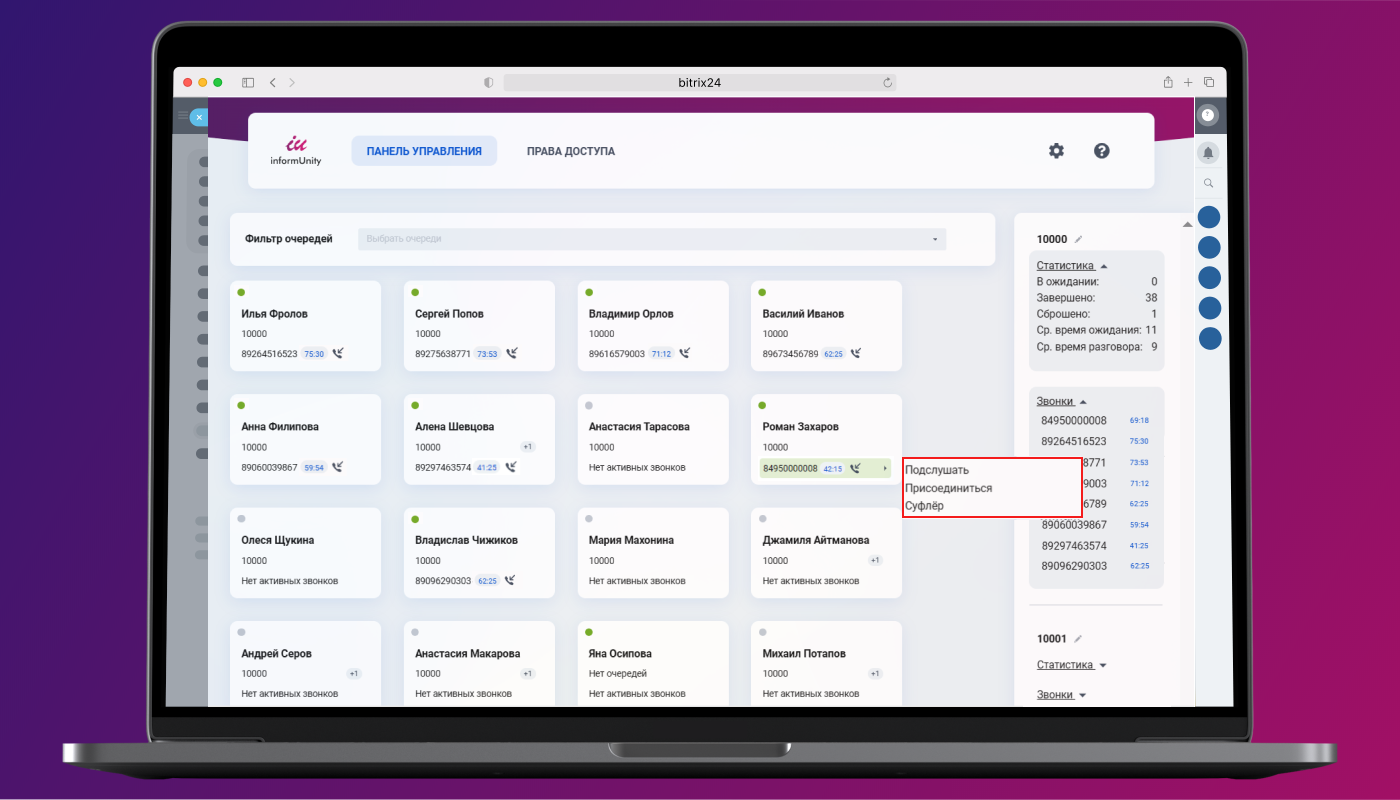Инструмент для управления колл-центром, интегрированный с Битрикс24 и Asterisk. Дает полный контроль над звонками и работой операторов в реальном времени.