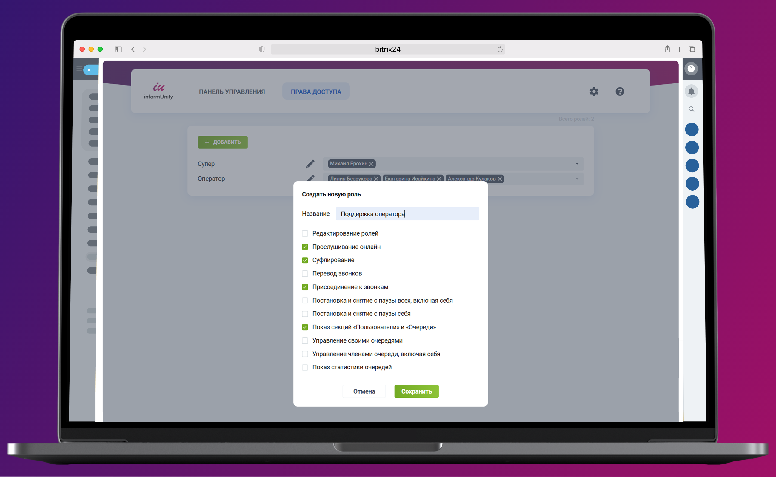 Гибкая настройка прав доступа: можно создавать роли (например, Администратор, Супервайзер, Оператор) и назначать каждому свои права — чтобы каждый видел только то, что ему нужно.