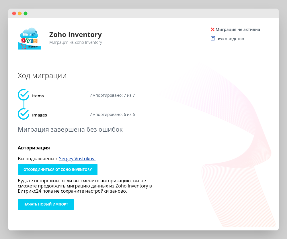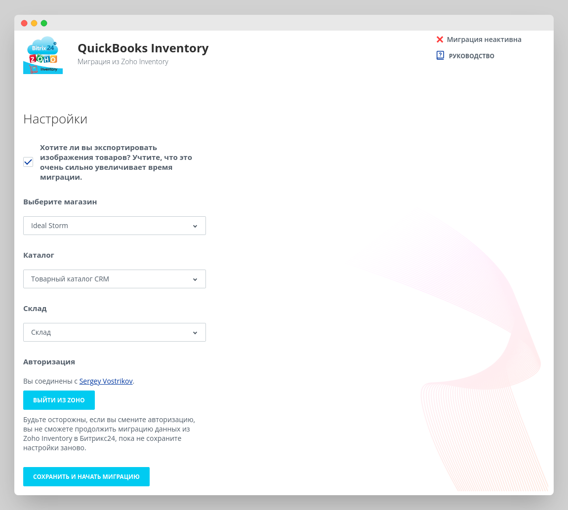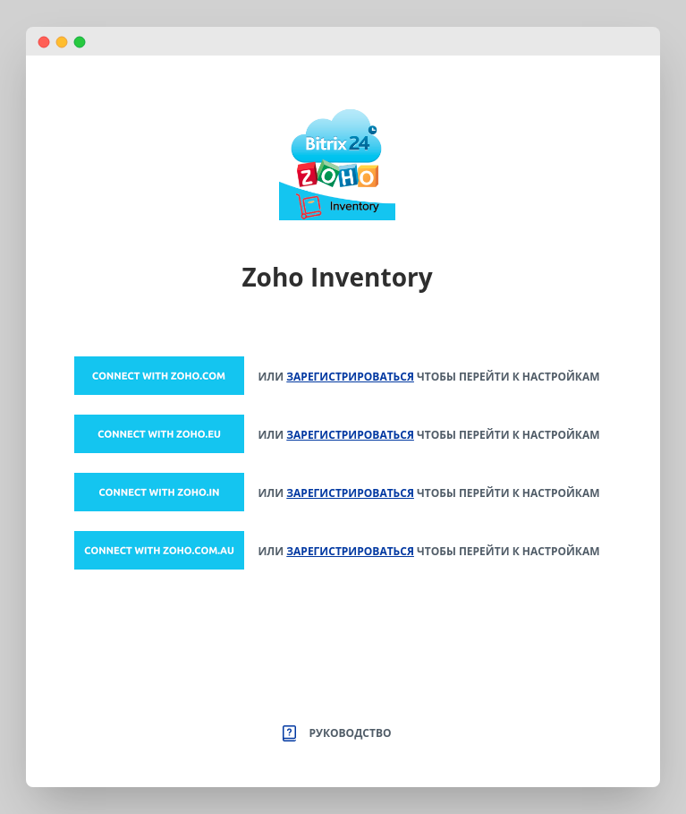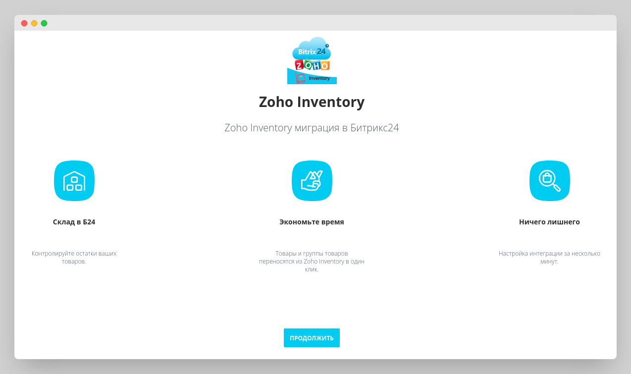 Приложение предназначено для импорта информации о товарах из вашего магазина Zoho Inventory в аккаунт Битрикс24.