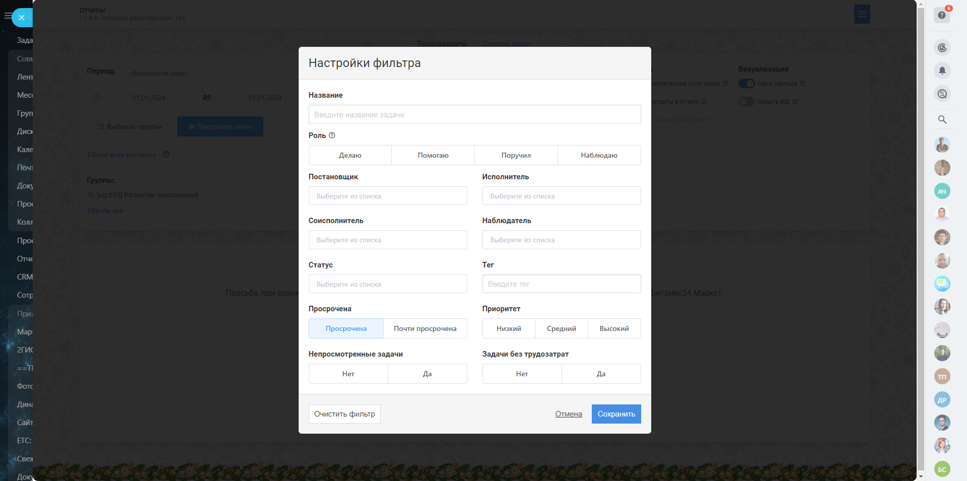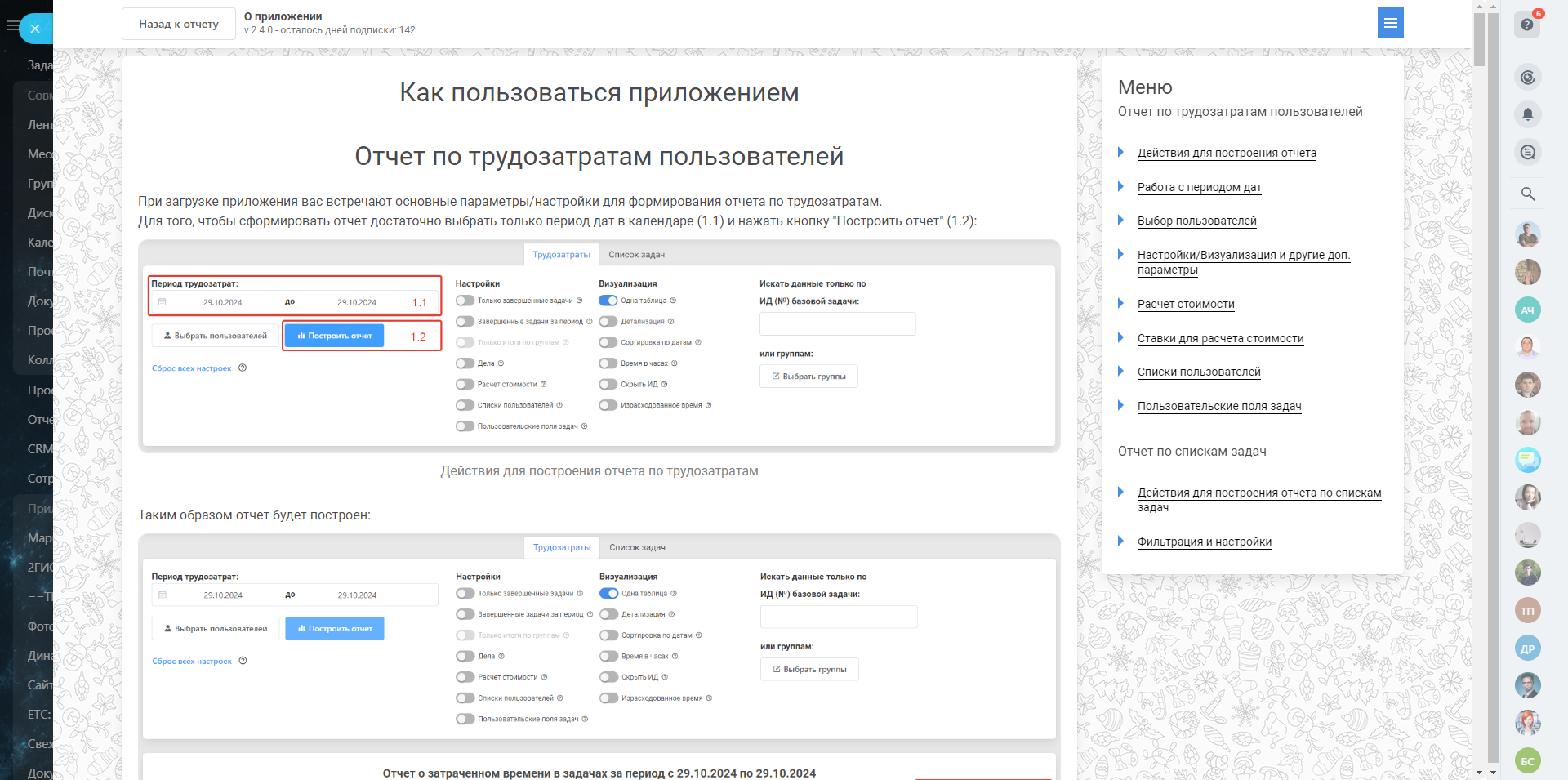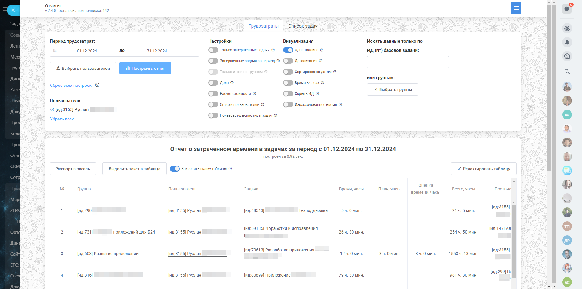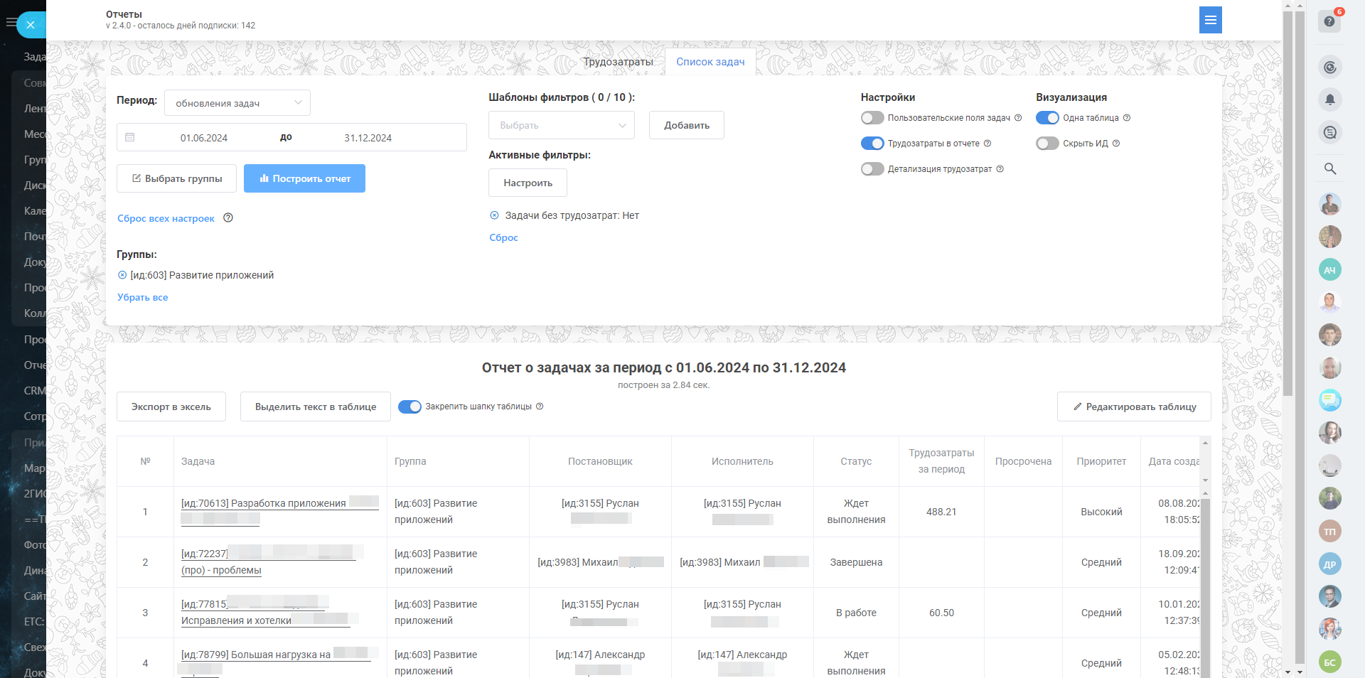 Приложение предназначено для формирования подробных отчетов по задачам и трудозатратам. Оно предоставляет широкие возможности для настройки результатов под индивидуальные потребности пользователя, включая кастомизацию таблиц и фильтрацию данных.