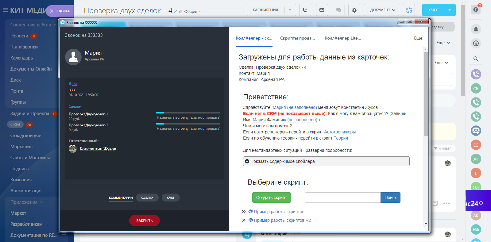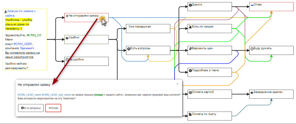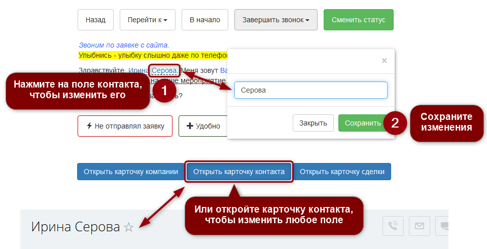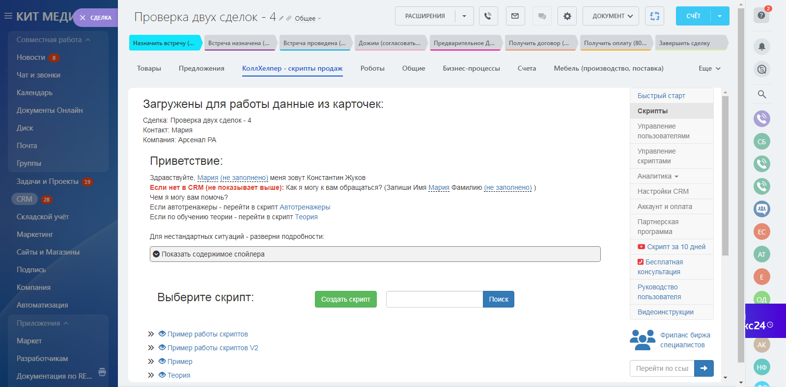Полная интеграция с CRM - данные о клиенте, лиде, сделке и компании - прямо в тексте скрипта и доступны для редактирования.