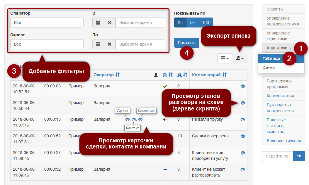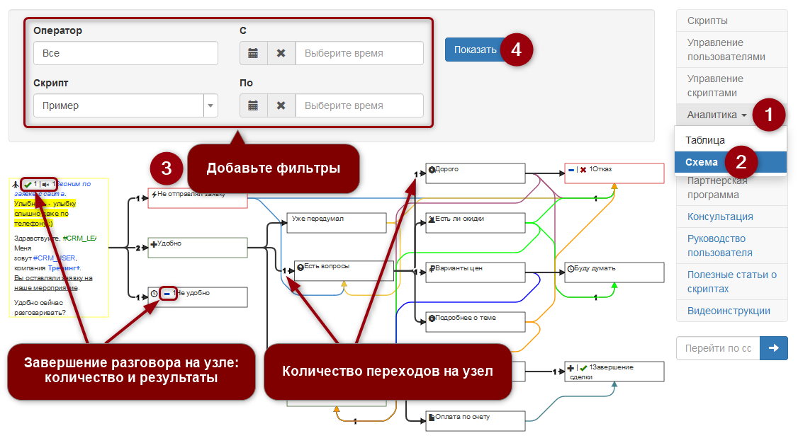 Визуальная аналитика! Данные о прохождении скриптов в виде таблицы или схемы с количеством переходов на конкретный узел скрипта, количеством и типом завешенных звонков на каждом узле.