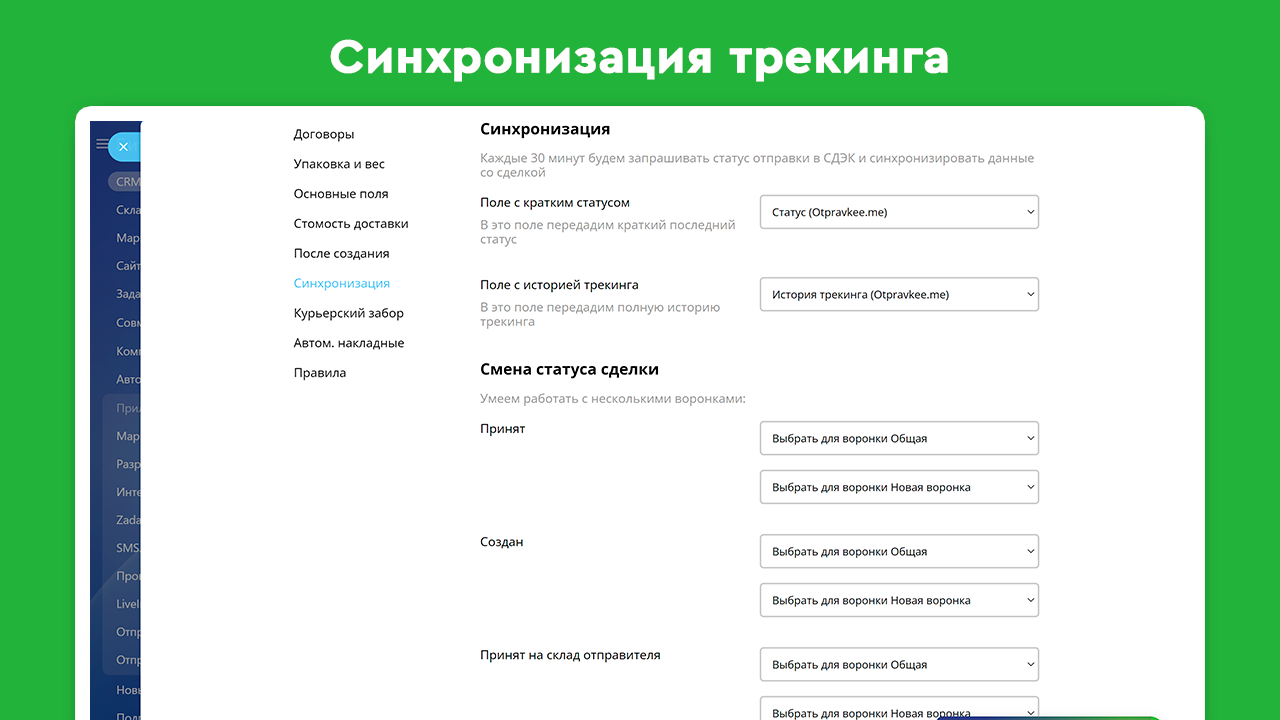 - Синхронизировать статусы отправок СДЭК со сделками: получать текстовый статус, историю статусов и менять статусы сделок по неограниченному количеству воронок