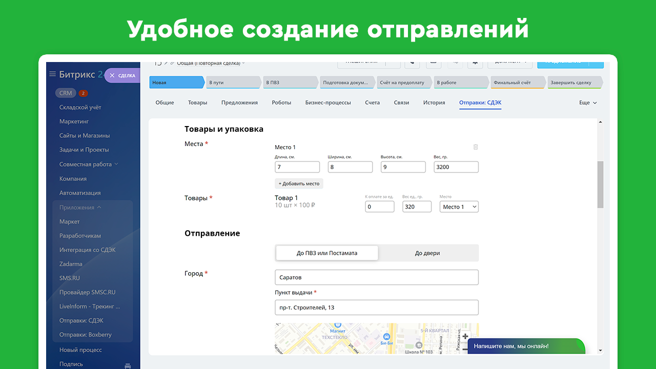 Удобное создание отправлений СДЭК прямо из сделки или элемента смарт-процесса с подгрузкой всех основных данных, синхронизацией трекинга, печатью накладных, ШК и вызовом курьера