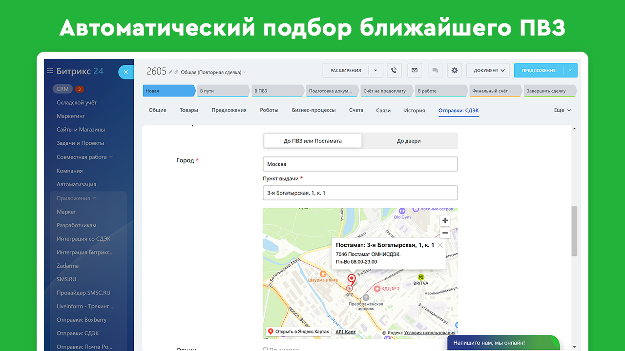 - Автоматический поиск ближайшего ПВЗ/Постамата до клиента