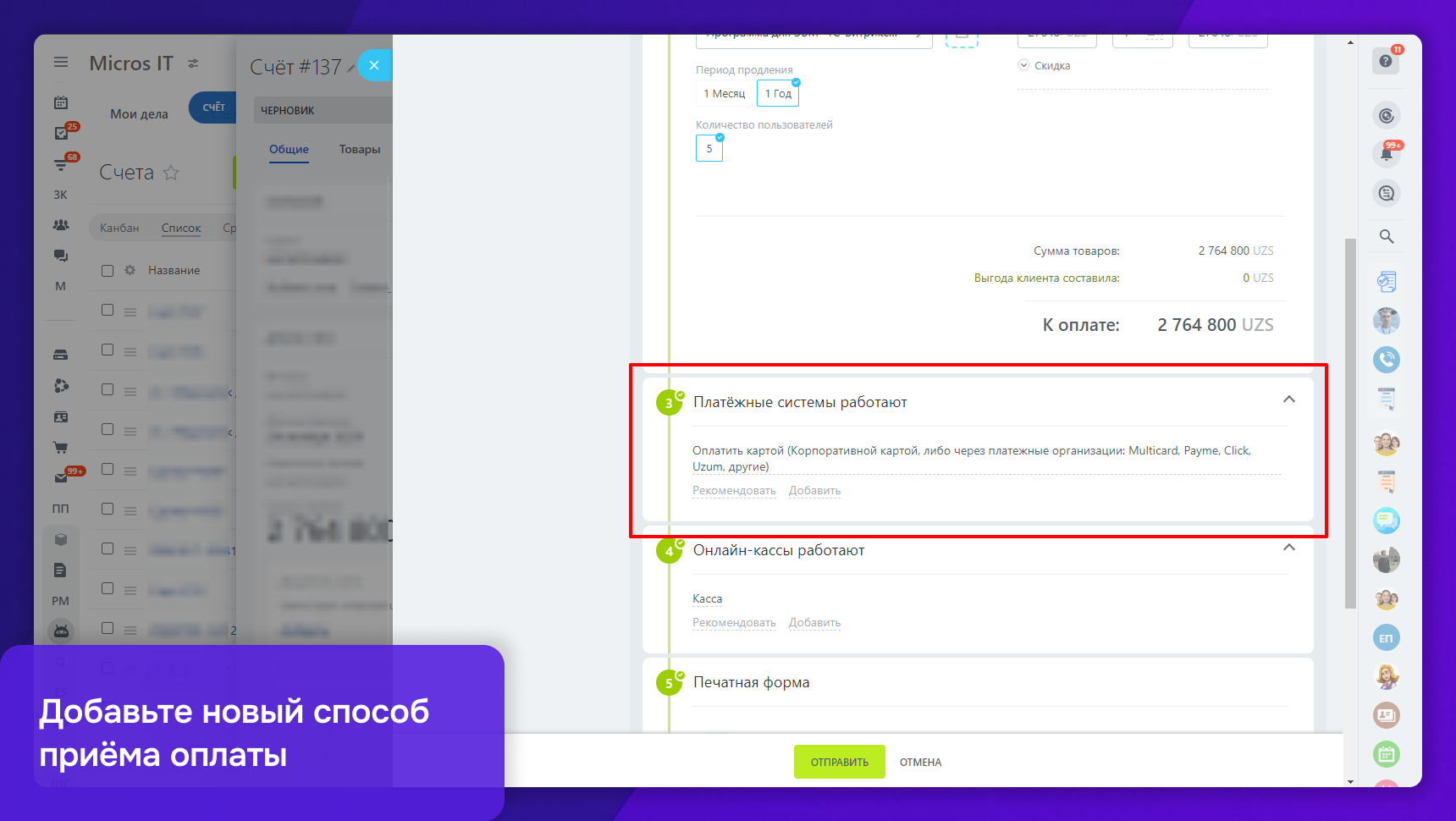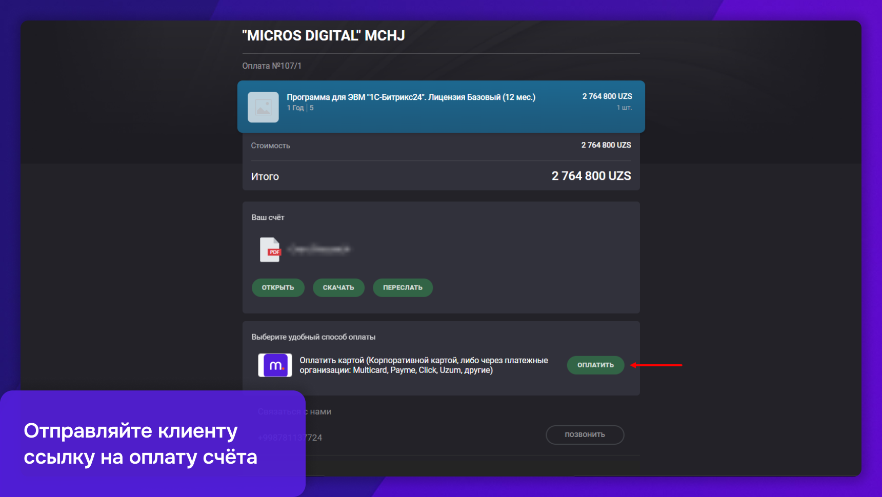 - Автоматически отправлять клиентам ссылки на оплату с зачислением средств на нужный расчётный счёт.