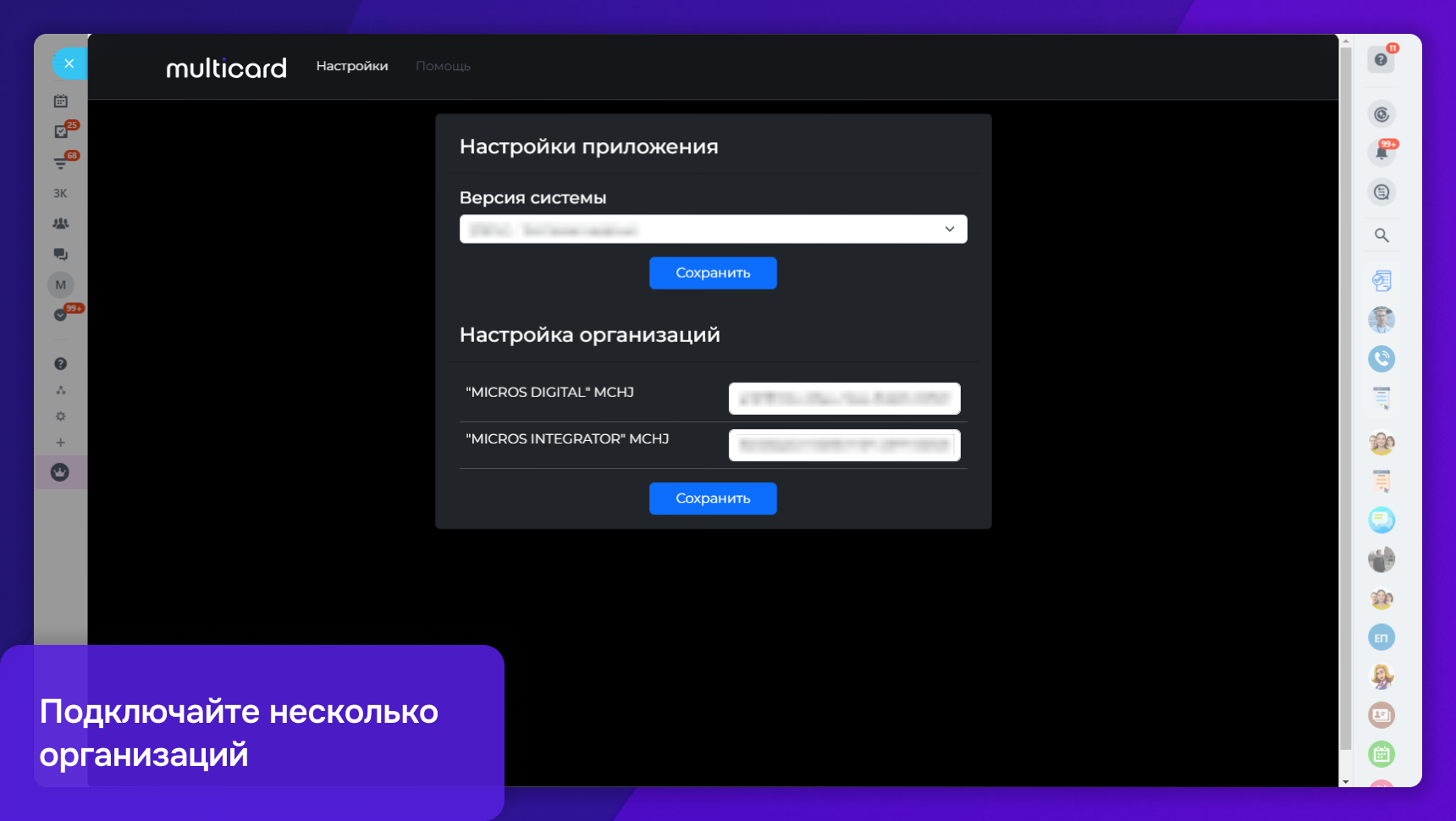 Модуль поддерживает подключение нескольких юридических лиц в рамках одной интеграции. Это позволяет: